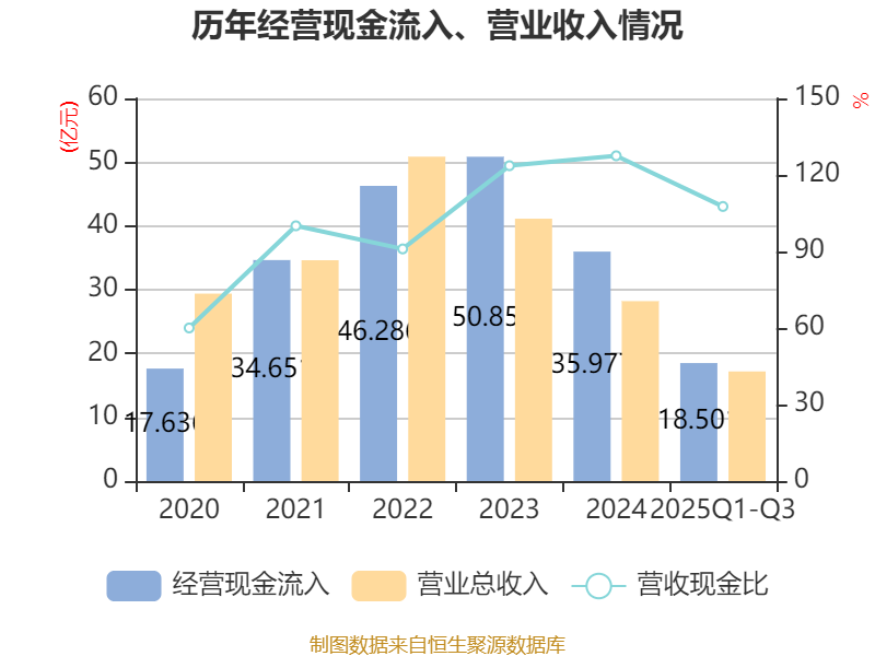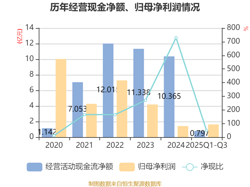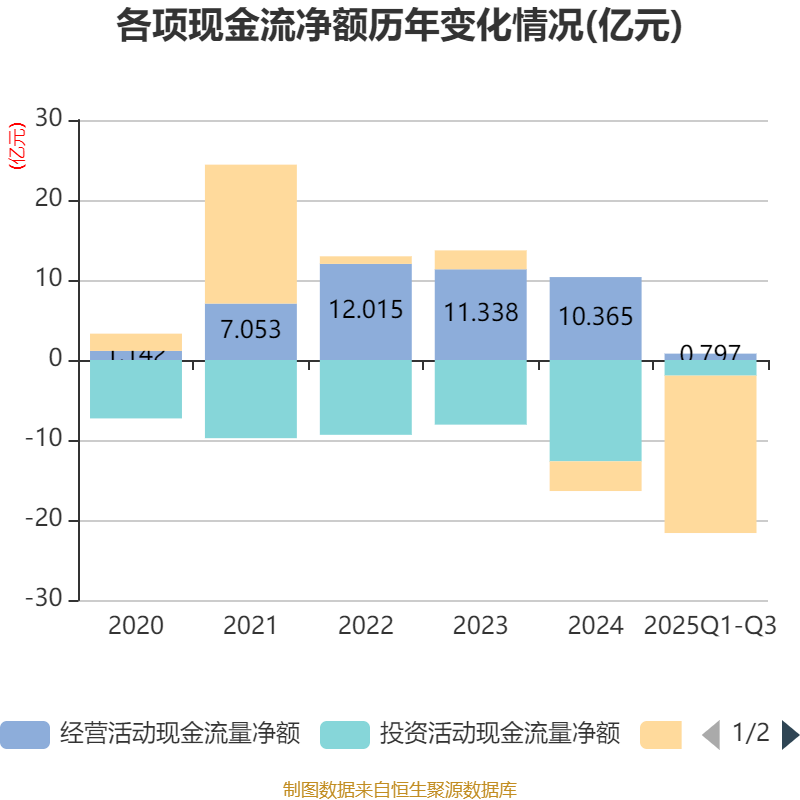 2025年前三季度,公司经营活动现金流净额为7969.21万元,同比下降85.75%;筹资活动现金流净额-19.67亿元,同比减少18.49亿元;投资活动现金流净额-1.95亿元,上年同期为-11.72亿元。