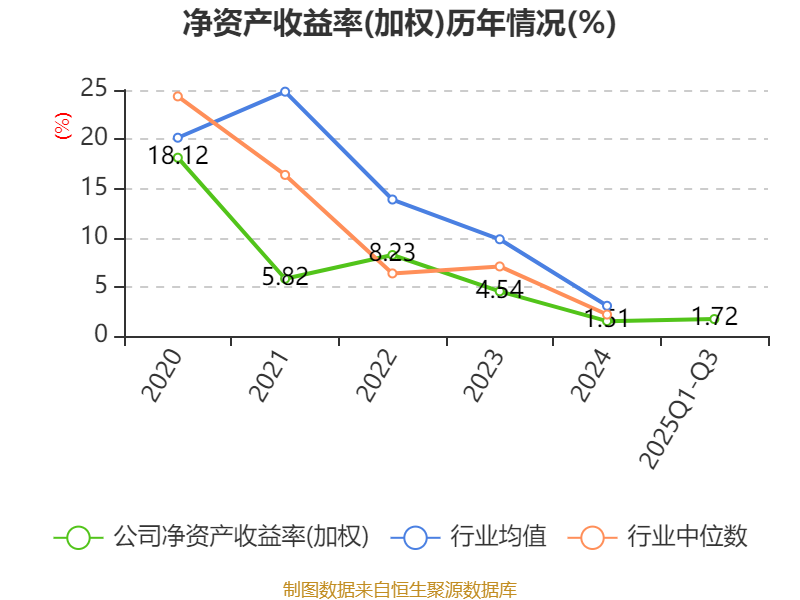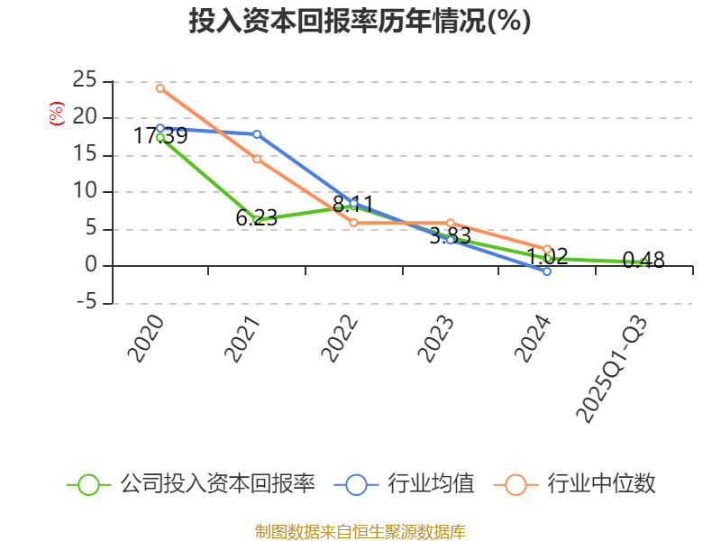 盈利能力方面, 2025年前三季度公司加权平均净资产收益率为1.72%,同比下降0.99个百分点。公司2025年前三季度投入资本回报率为0.48%,较上年同期下降2.07个百分点。