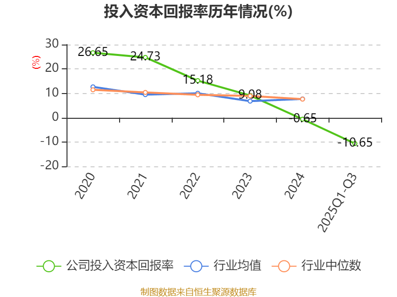 盈利能力方面, 2025年前三季度公司加权平均净资产收益率为-16.68%,同比下降17.65个百分点。公司2025年前三季度投入资本回报率为-10.65%,较上年同期下降10.27个百分点。