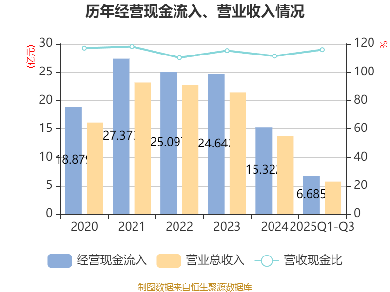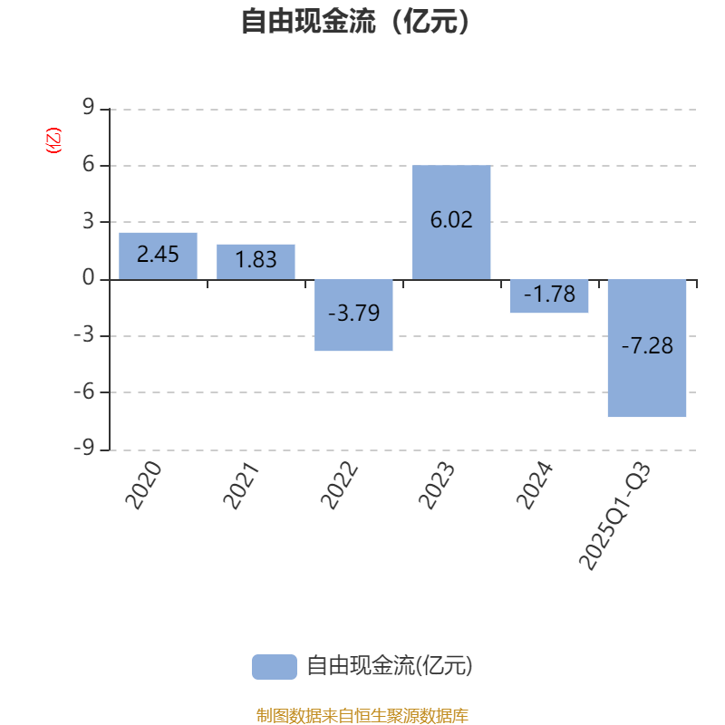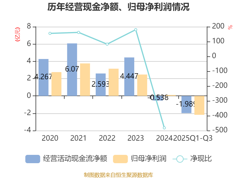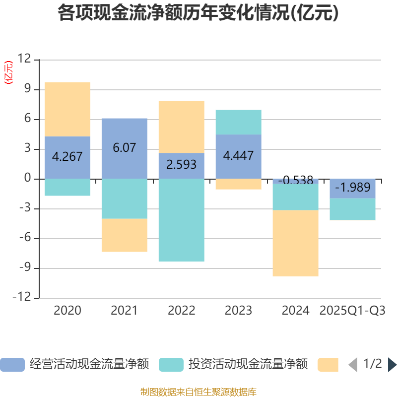 2025年前三季度,公司经营活动现金流净额为-1.99亿元,同比减少9892.61万元;筹资活动现金流净额-278.93万元,同比增加6.63亿元;投资活动现金流净额-2.18亿元,上年同期为-2.44亿元。