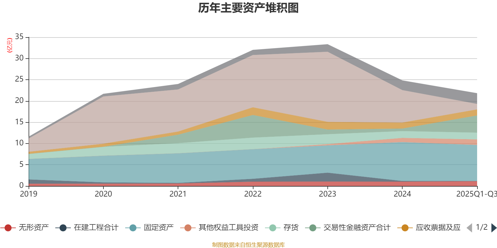 资产重大变化方面,截至2025年三季度末,公司货币资金较上年末减少83.14%,占公司总资产比重下降24.87个百分点;交易性金融资产合计较上年末增加572.82%,占公司总资产比重上升16.08个百分点;固定资产较上年末减少7.25%,占公司总资产比重上升2.03个百分点;其他权益工具投资较上年末增加32.08%,占公司总资产比重上升1.99个百分点。