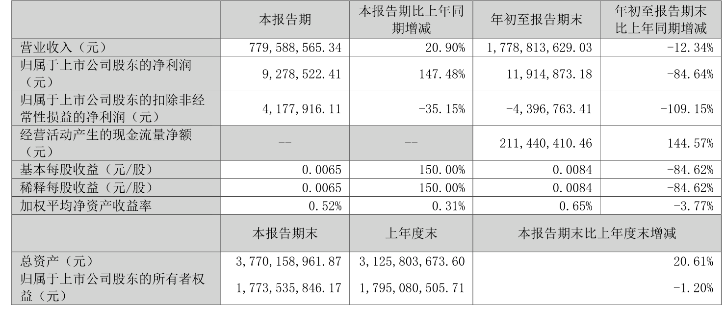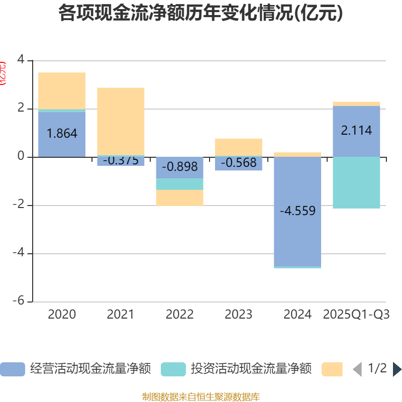 2025年前三季度,公司经营活动现金流净额为2.11亿元,同比增加6.86亿元;筹资活动现金流净额1666.53万元,同比增加4383.53万元;投资活动现金流净额-2.14亿元,上年同期为137.51万元。