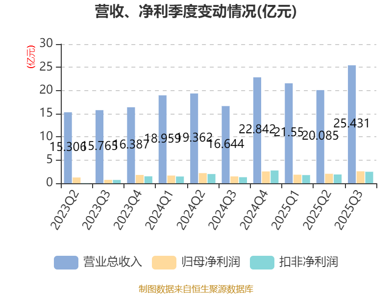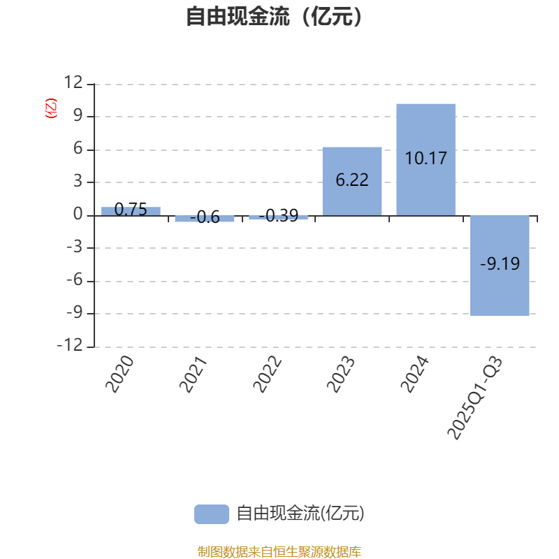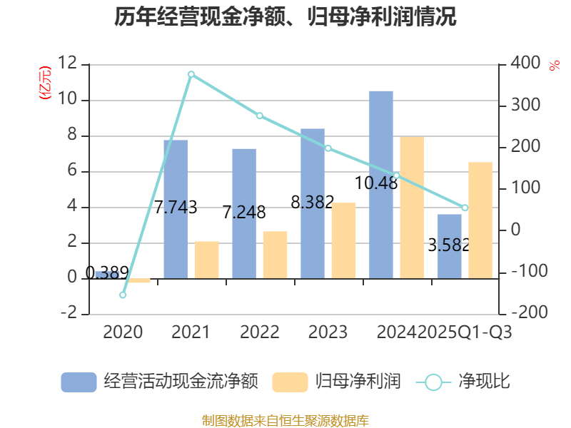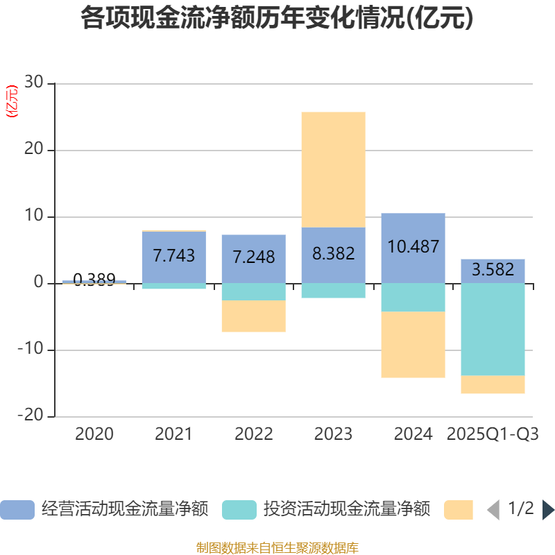2025年前三季度,公司经营活动现金流净额为3.58亿元,同比下降45.32%;筹资活动现金流净额-2.68亿元,同比增加6.87亿元;投资活动现金流净额-13.92亿元,上年同期为-13.78亿元。