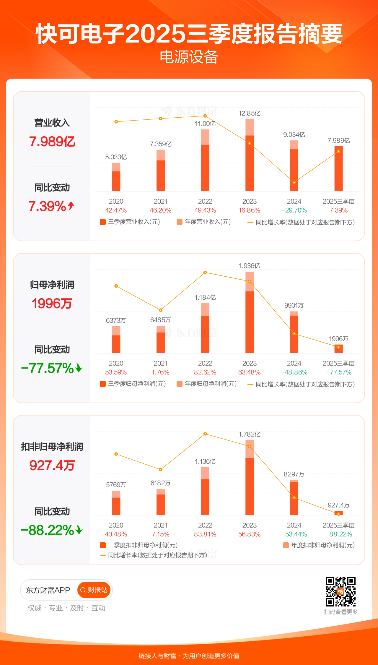 快可电子10月23日发布2025年三季报显示,公司前三季实现营业收入7.99亿元,同比增长7.39%;归母净利润1996.06万元,同比下滑77.57%;扣非归母净利润927.44万元,同比下滑88.22%。