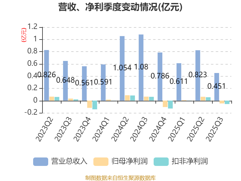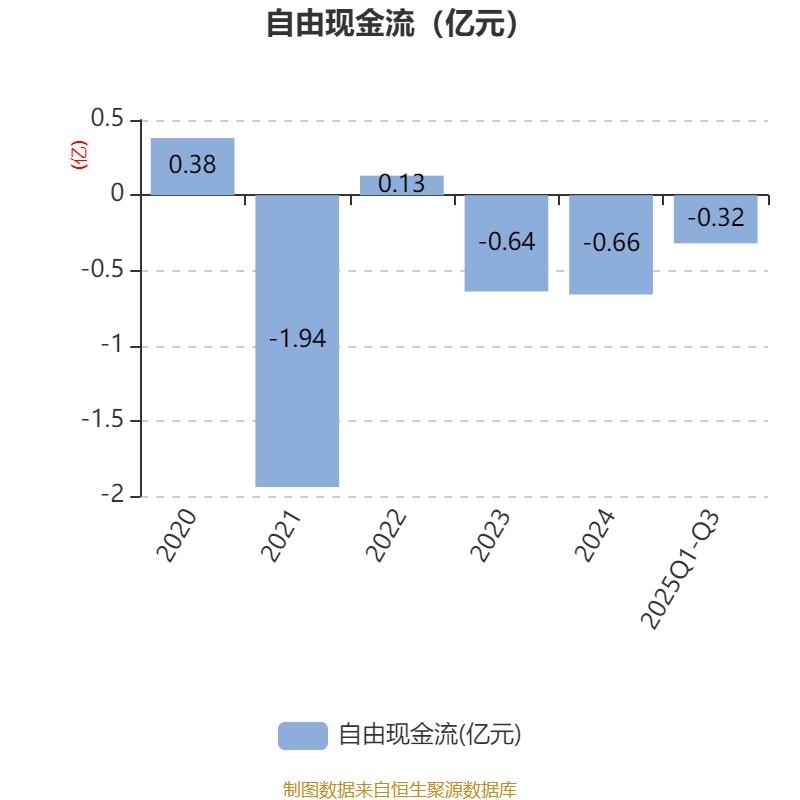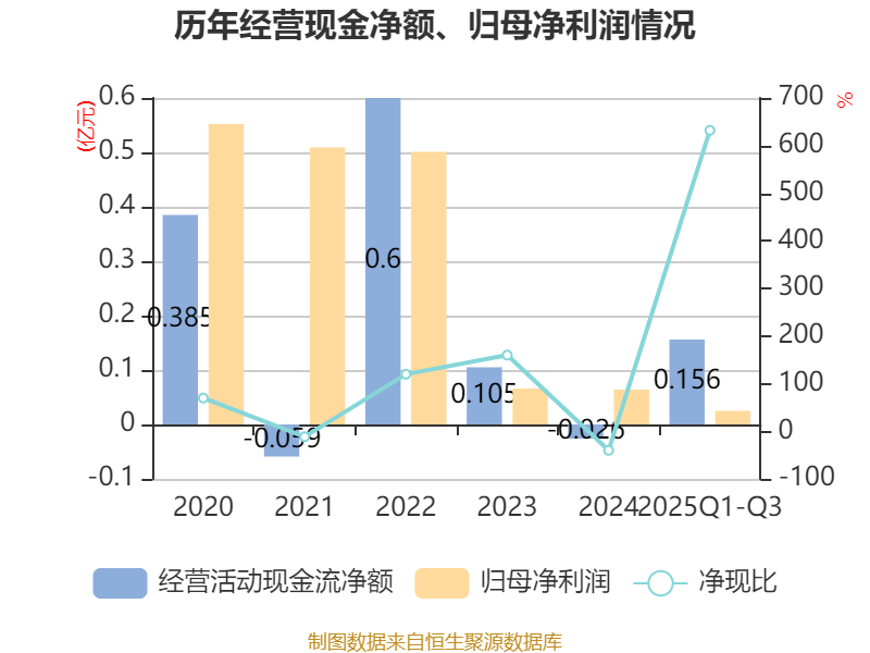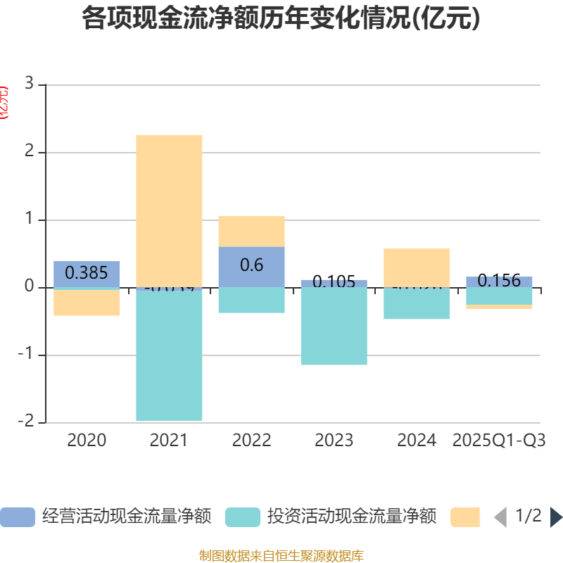 2025年前三季度,公司经营活动现金流净额为1556.46万元,同比增加3666.62万元;筹资活动现金流净额-642.7万元,同比减少6016.97万元;投资活动现金流净额-2598.35万元,上年同期为-3969.6万元。
