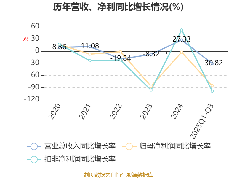 资产重大变化方面,截至2025年三季度末,公司固定资产较上年末增加0.05%,占公司总资产比重上升2.75个百分点;存货较上年末减少20.78%,占公司总资产比重下降1.93个百分点;货币资金较上年末减少83.86%,占公司总资产比重下降1.78个百分点;应收款项融资较上年末减少77.41%,占公司总资产比重下降0.84个百分点。