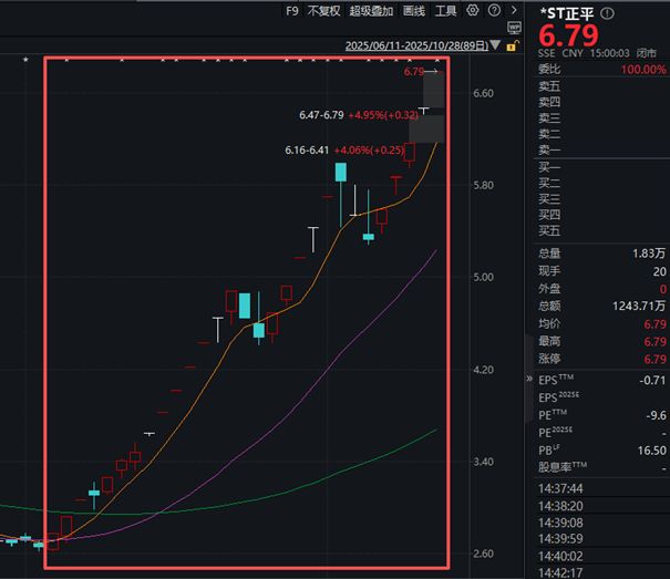 Wind金融终端数据显示,9月3日—10月28日收盘,除去停牌的5个交易日,*ST正平在29个交易日内收获21个涨停板,期间累计涨幅156.23%。期间,公司发布多份异动公告和股票交易的风险提示。就在昨日(10月27日)晚间,*ST正平还发布一份风险提示。