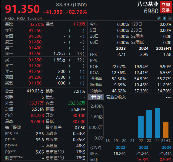 其次则是八马茶业,超额认购倍数超过2000倍,达到2680.04倍,股价表现也较为亮眼。