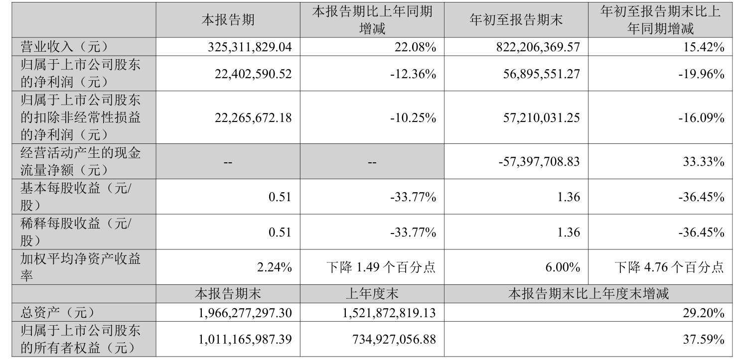 中证智能财讯常友科技(301557)10月29日披露2025年第三季度报告。前三季度公司实现营业总收入8.22亿元,同比增长15.42%;归母净利润5689.56万元,同比下降19.96%;扣非净利润5721万元;经营活动产生的现金流量净额为-5739.77万元,上年同期为-8609.15万元;报告期内,常友科技基本每股收益为1.36元,加权平均净资产收益率为6.00%。
