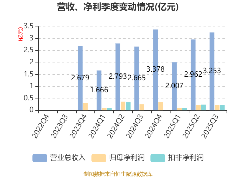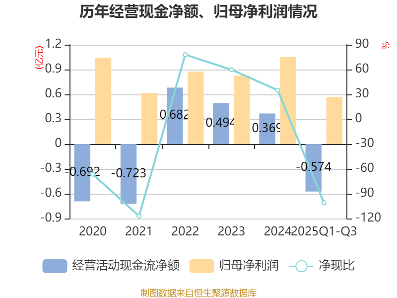 2025年前三季度,公司经营活动现金流净额为-5739.77万元,同比增加2869.38万元;筹资活动现金流净额2.3亿元,同比增加1.91亿元;投资活动现金流净额-1.83亿元,上年同期为-6576.66万元。