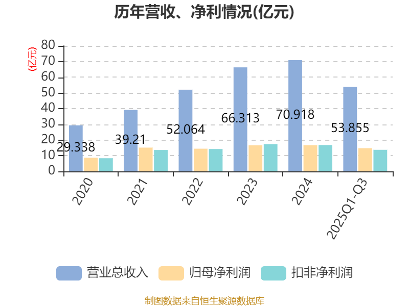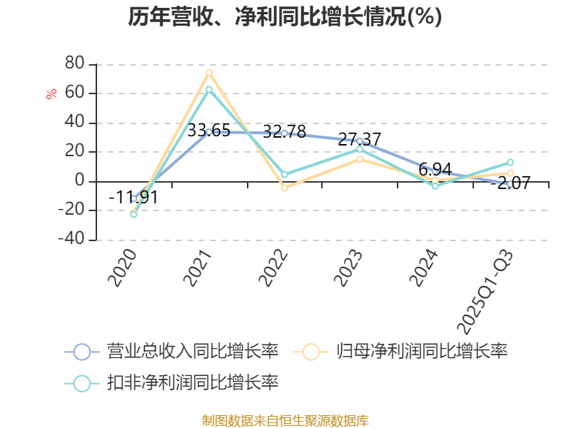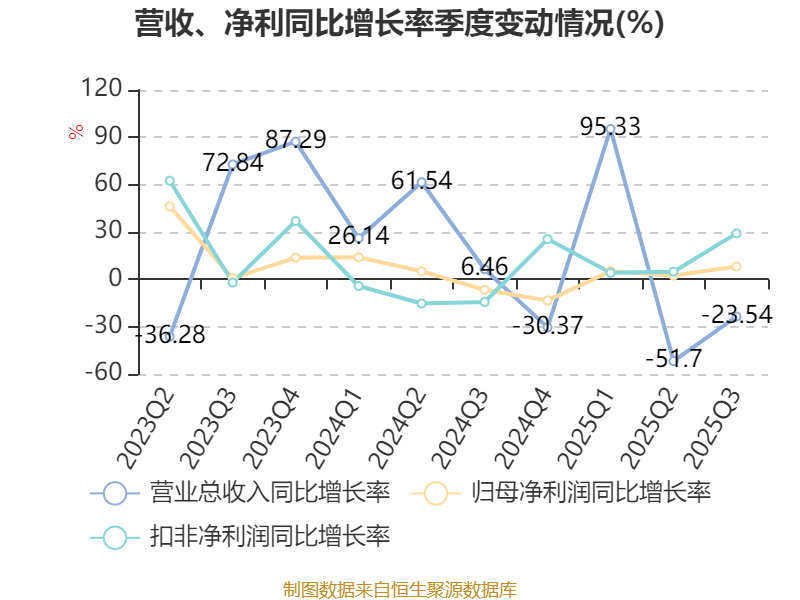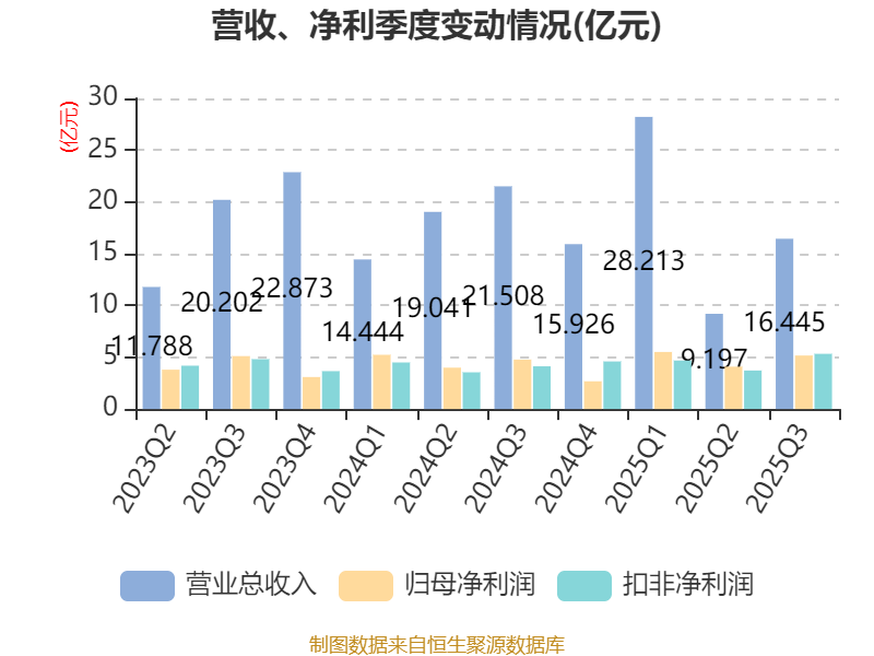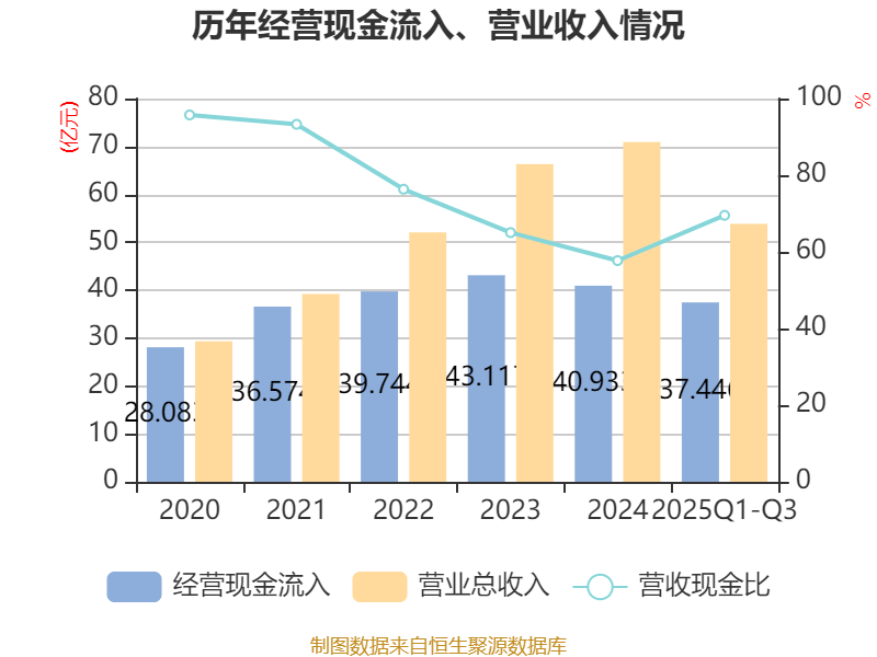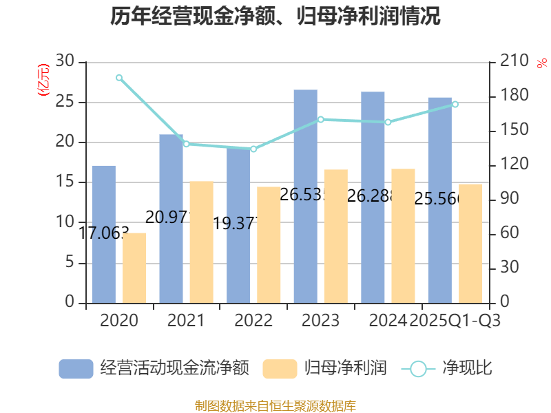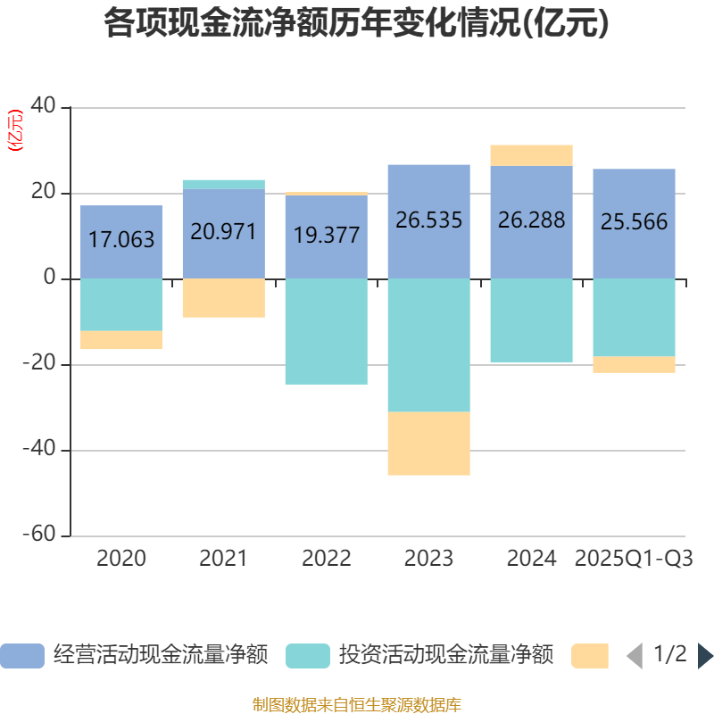 2025年前三季度,公司经营活动现金流净额为25.57亿元,同比增长4.03%;筹资活动现金流净额-3.82亿元,同比增加10.72亿元;投资活动现金流净额-18.24亿元,上年同期为-3.09亿元。