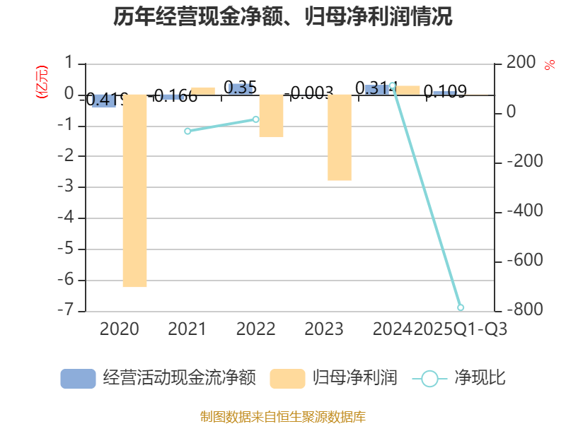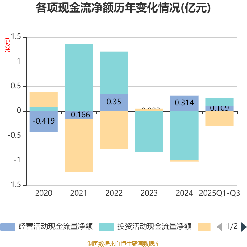 2025年前三季度,公司经营活动现金流净额为1090.75万元,同比下降53.21%;筹资活动现金流净额-2945.97万元,同比增加22.51万元;投资活动现金流净额1655.75万元,上年同期为-1.04亿元。