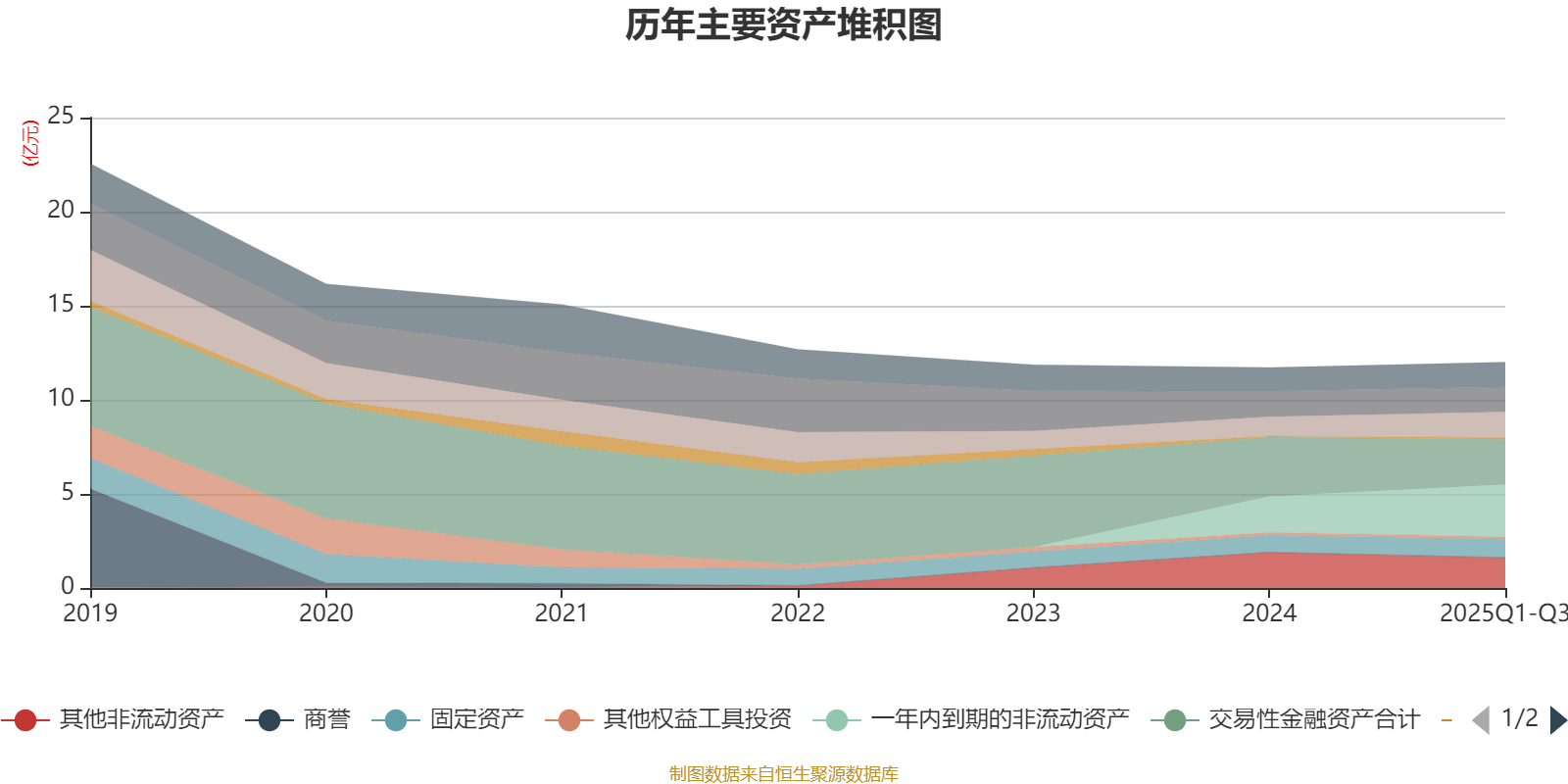 资产重大变化方面,截至2025年三季度末,公司交易性金融资产合计较上年末减少23.77%,占公司总资产比重下降6.88个百分点;一年内到期的非流动资产较上年末增加45.48%,占公司总资产比重上升6.85个百分点;其他非流动资产较上年末减少15.02%,占公司总资产比重下降2.77个百分点;应收票据及应收账款较上年末增加33.51%,占公司总资产比重上升2.65个百分点。