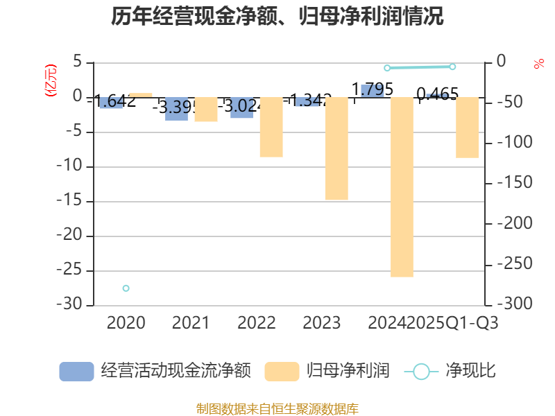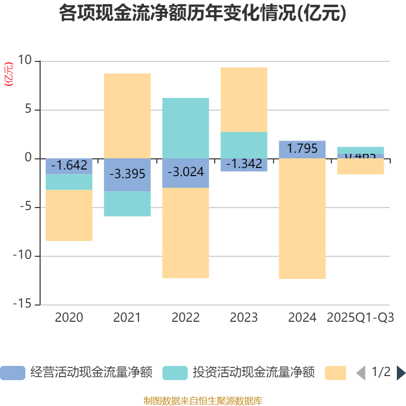 2025年前三季度,公司经营活动现金流净额为4648.86万元,同比增加3.88亿元;筹资活动现金流净额-1.64亿元,同比增加8190.41万元;投资活动现金流净额7092.71万元,上年同期为75.49万元。