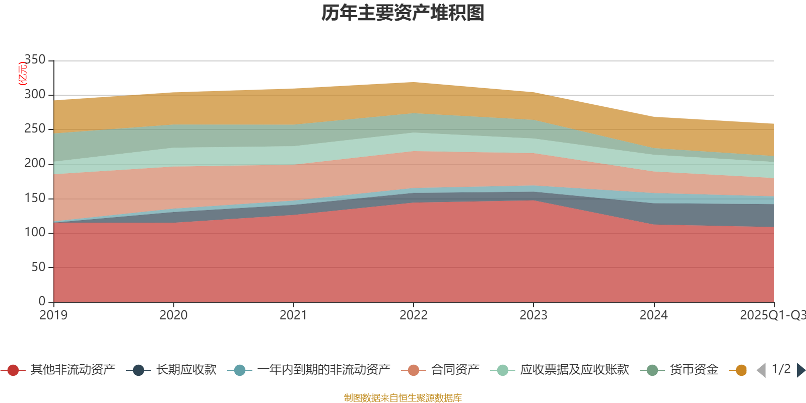 资产重大变化方面,截至2025年三季度末,公司合同资产较上年末减少15.16%,占公司总资产比重下降1.37个百分点;长期应收款较上年末增加7.57%,占公司总资产比重上升1.35个百分点;一年内到期的非流动资产较上年末减少23.51%,占公司总资产比重下降1.14个百分点;其他应收款(含利息和股利)较上年末增加8.86%,占公司总资产比重上升0.48个百分点。