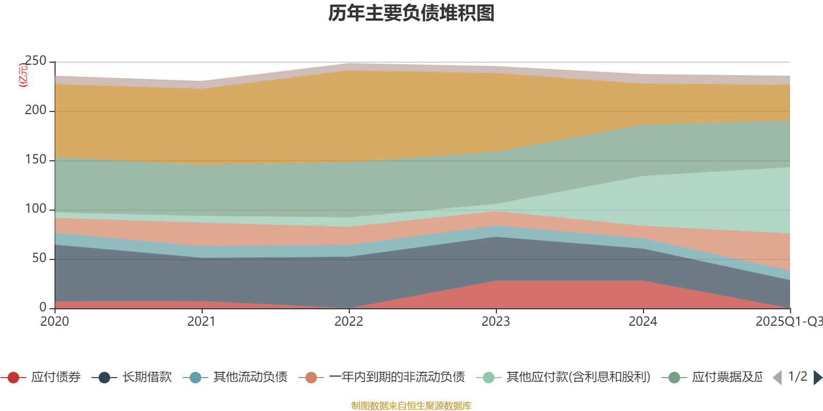 负债重大变化方面,截至2025年三季度末,公司应付债券较上年末减少100%,占公司总资产比重下降10.42个百分点;一年内到期的非流动负债较上年末增加200.2%,占公司总资产比重上升9.96个百分点;其他应付款(含利息和股利)较上年末增加32.44%,占公司总资产比重上升7.09个百分点;短期借款较上年末减少12.74%,占公司总资产比重下降1.44个百分点。