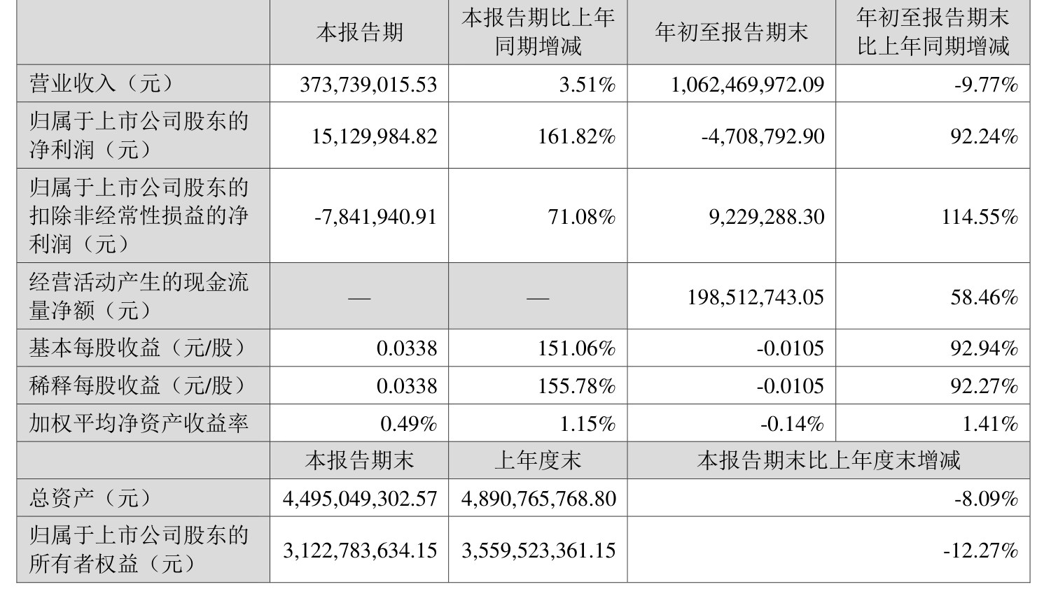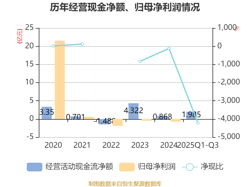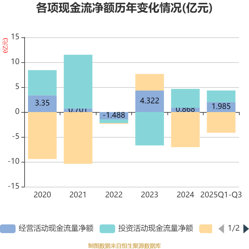 2025年前三季度,公司经营活动现金流净额为1.99亿元,同比增长58.46%;筹资活动现金流净额-4.16亿元,同比增加2.6亿元;投资活动现金流净额2.34亿元,上年同期为2.88亿元。