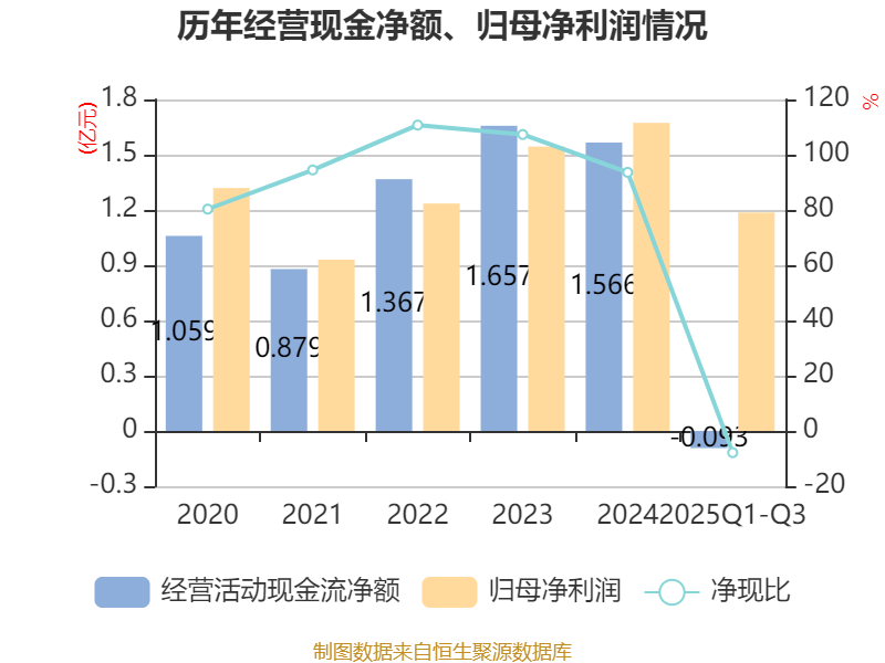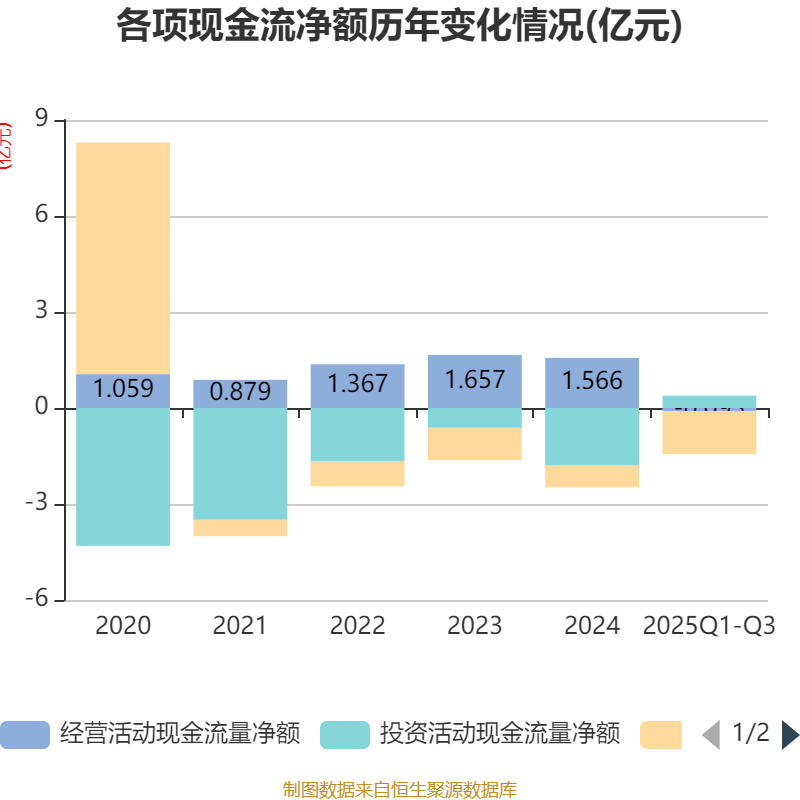2025年前三季度,公司经营活动现金流净额为-932.78万元,同比减少4532.72万元;筹资活动现金流净额-1.35亿元,同比减少5646.16万元;投资活动现金流净额3856.33万元,上年同期为-1.5亿元。