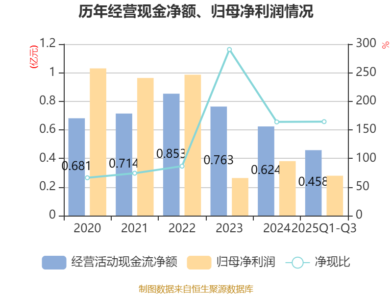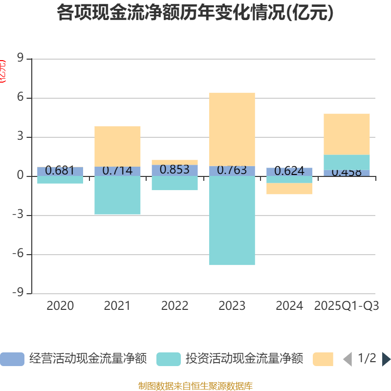 2025年前三季度,公司经营活动现金流净额为4578.43万元,同比下降62.07%;筹资活动现金流净额3.14亿元,同比增加2.21亿元;投资活动现金流净额1.18亿元,上年同期为-1.93亿元。