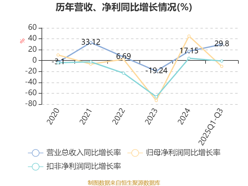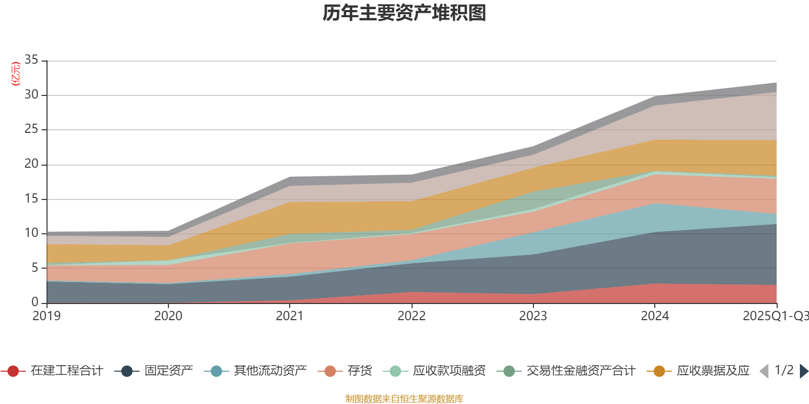 资产重大变化方面,截至2025年三季度末,公司其他流动资产较上年末减少65.01%,占公司总资产比重下降9.37个百分点;货币资金较上年末增加40.52%,占公司总资产比重上升5.27个百分点;固定资产较上年末增加18%,占公司总资产比重上升2.67个百分点;存货较上年末增加22.8%,占公司总资产比重上升2.12个百分点。