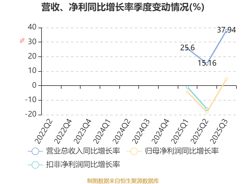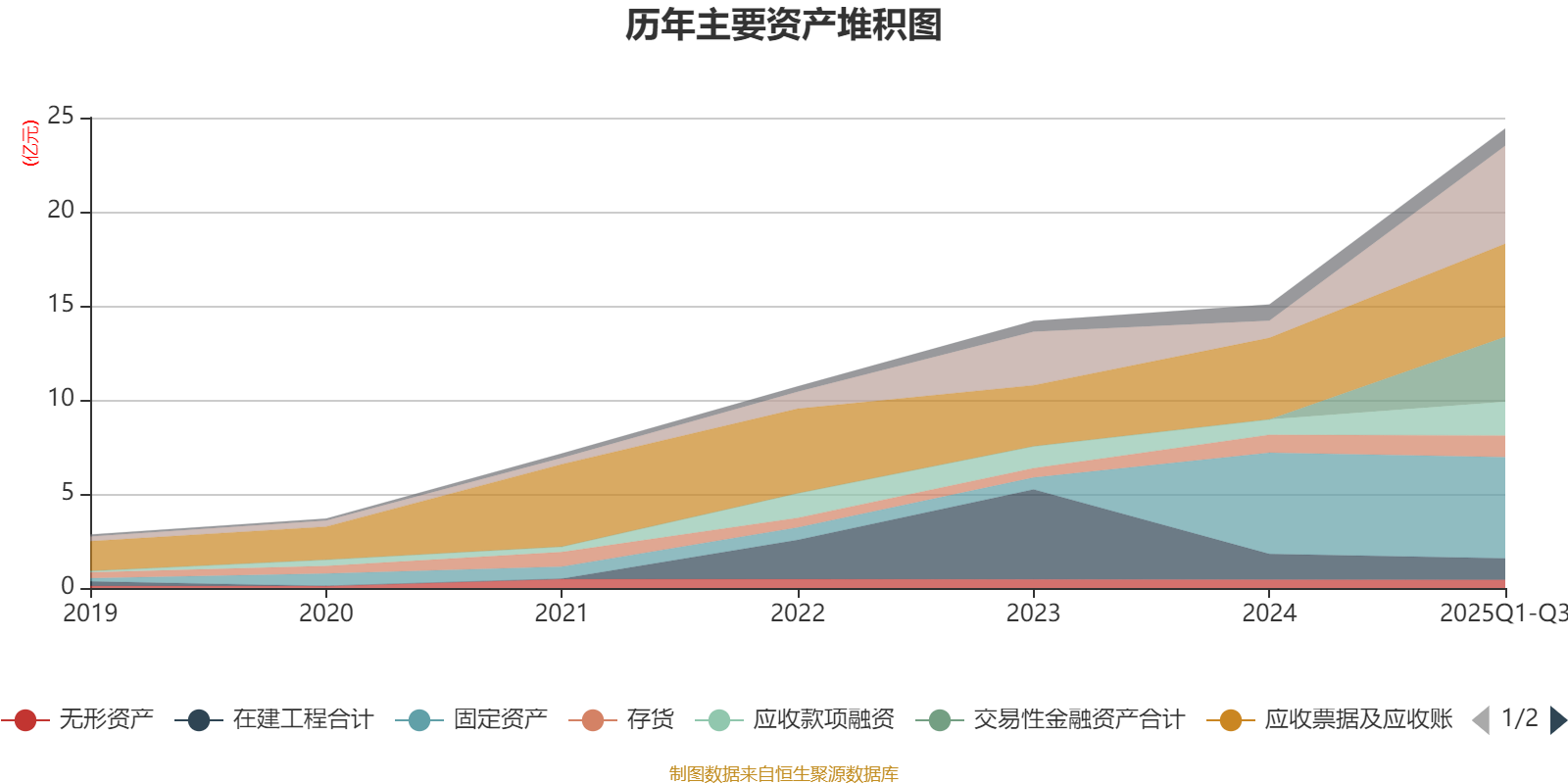 资产重大变化方面,截至2025年三季度末,公司货币资金较上年末增加472.48%,占公司总资产比重上升15.3个百分点;交易性金融资产合计占公司总资产的14.15%,上年末为0;固定资产较上年末减少0.02%,占公司总资产比重下降13.69个百分点;应收票据及应收账款较上年末增加14.16%,占公司总资产比重下降8.51个百分点。