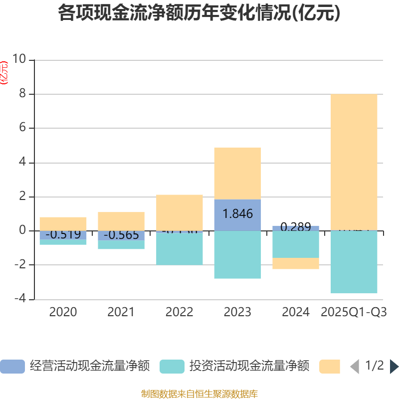 2025年前三季度,公司经营活动现金流净额为453.06万元,同比下降92.17%;筹资活动现金流净额7.96亿元,同比增加9.14亿元;投资活动现金流净额-3.65亿元,上年同期为-1.34亿元。