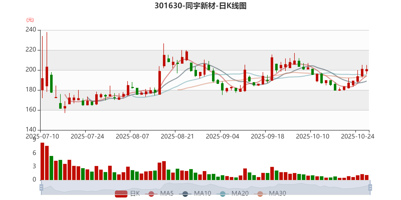 中证智能财讯同宇新材(301630)10月29日披露2025年第三季度报告。前三季度公司实现营业总收入8.99亿元,同比增长25.96%;归母净利润1.03亿元,同比下降6.62%;扣非净利润1.02亿元;经营活动产生的现金流量净额为453.06万元,同比下降92.17%;报告期内,同宇新材基本每股收益为3.1874元,加权平均净资产收益率为10.02%。