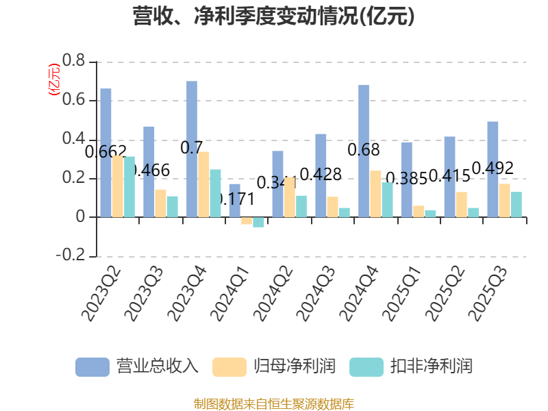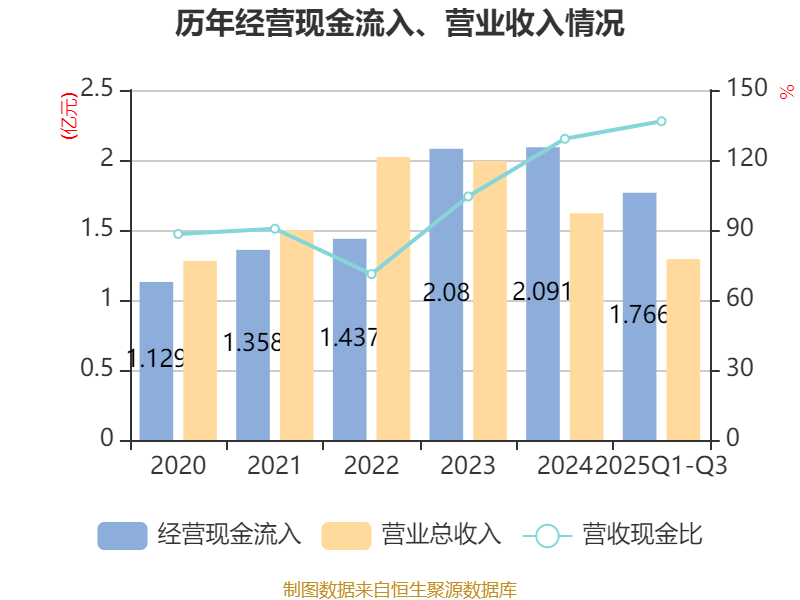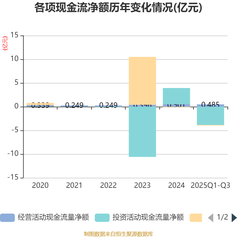 2025年前三季度,公司经营活动现金流净额为4846.13万元,同比增长178.93%;筹资活动现金流净额-1192.94万元,同比减少212.59万元;投资活动现金流净额-3.87亿元,上年同期为241.83万元。