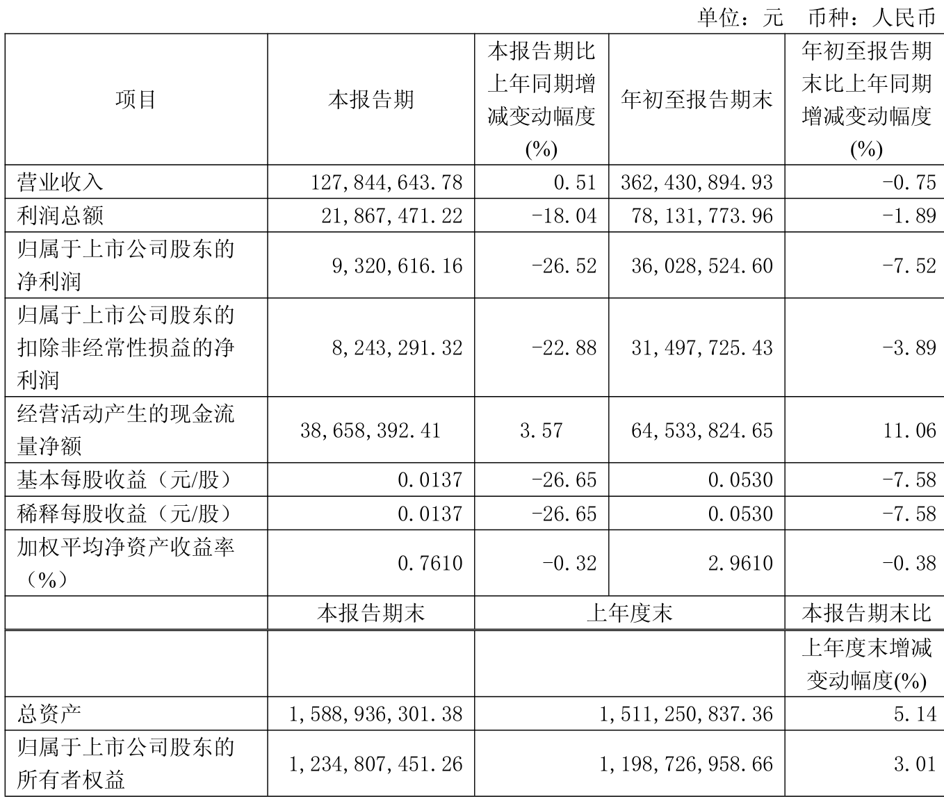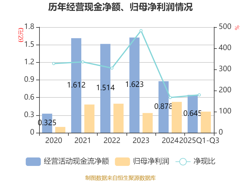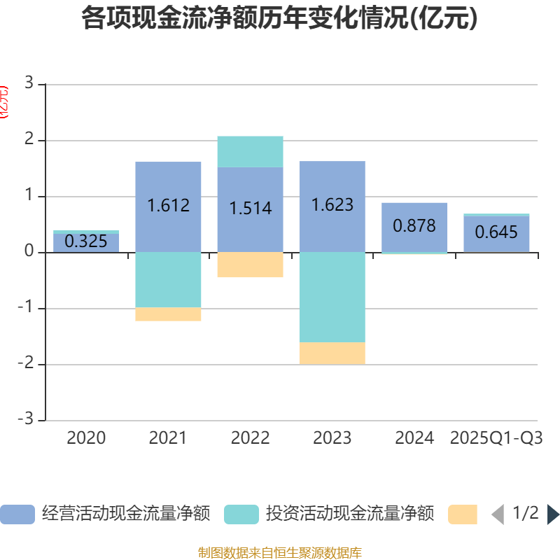2025年前三季度,公司经营活动现金流净额为6453.38万元,同比增长11.06%;筹资活动现金流净额-58.97万元,同比减少12.27万元;投资活动现金流净额400.83万元,上年同期为314.31万元。