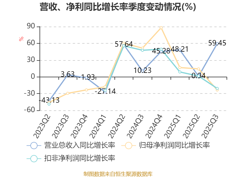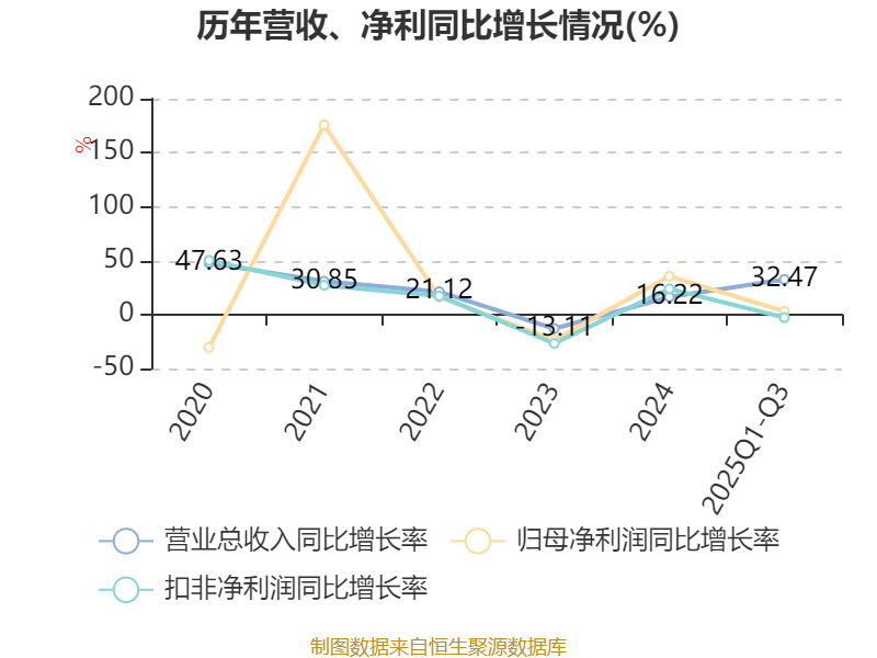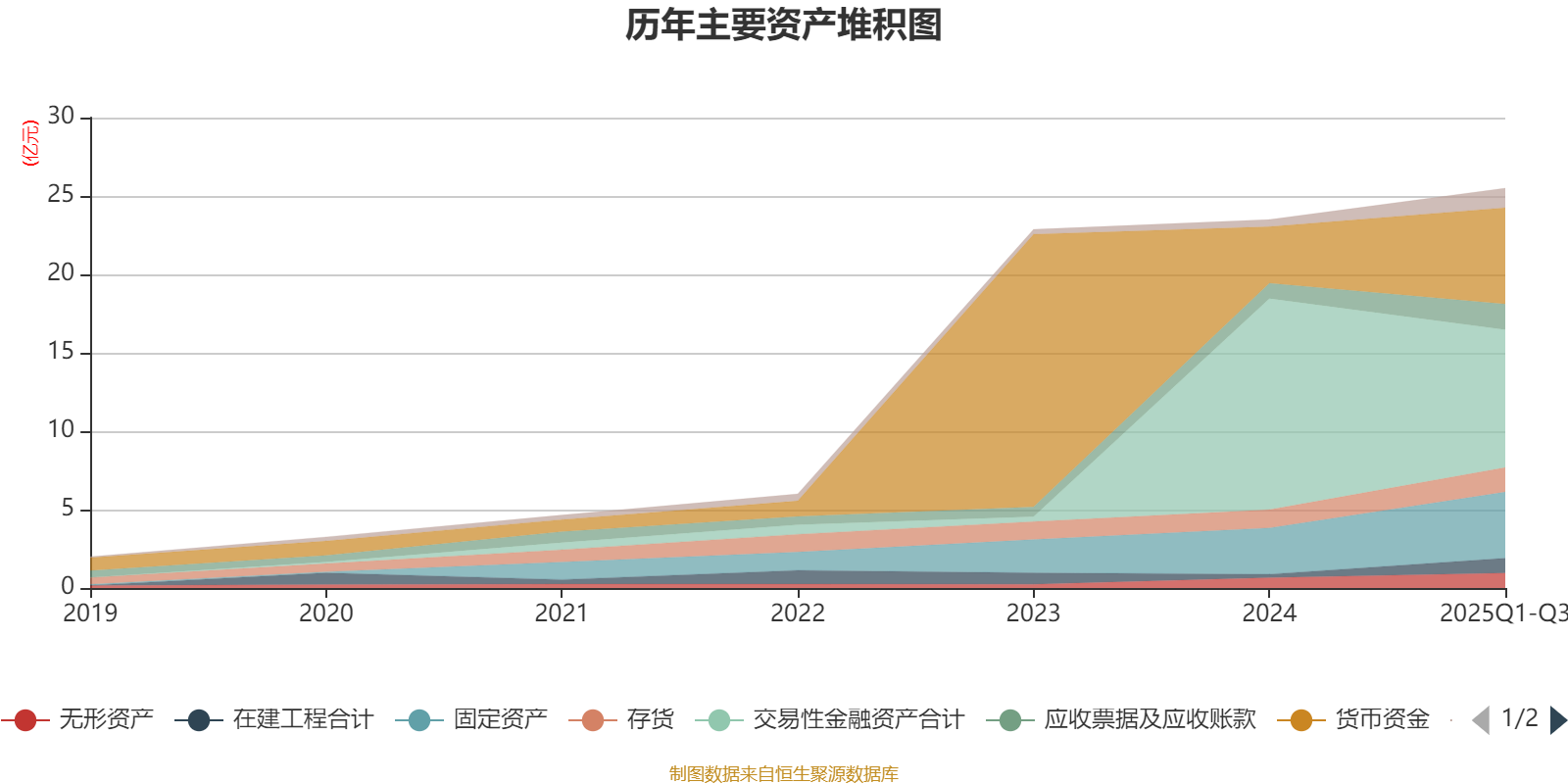 资产重大变化方面,截至2025年三季度末,公司交易性金融资产合计较上年末减少34.73%,占公司总资产比重下降22.84个百分点;货币资金较上年末增加70.32%,占公司总资产比重上升8.75个百分点;固定资产较上年末增加43.09%,占公司总资产比重上升4个百分点;商誉占公司总资产的2.81%,上年末为0。
