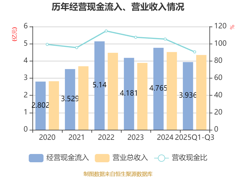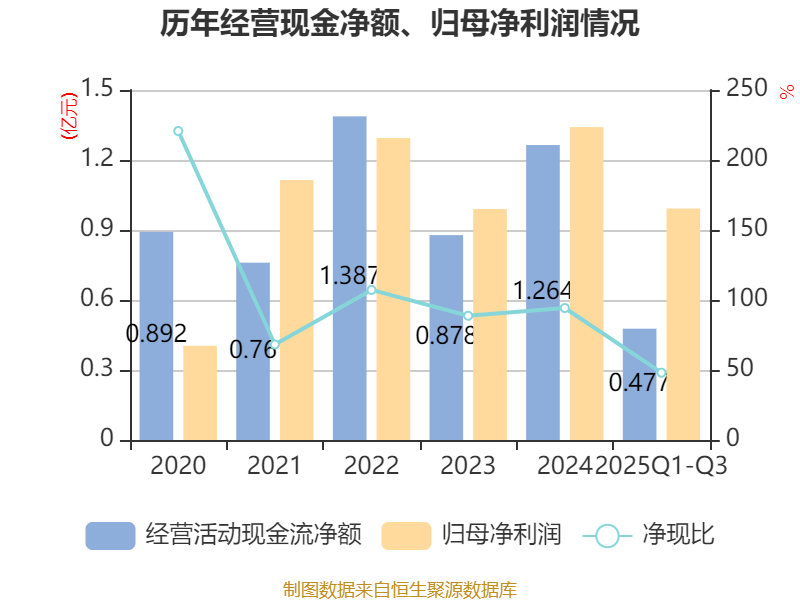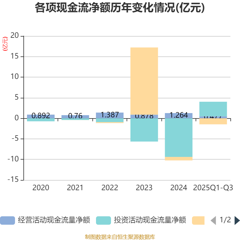 2025年前三季度,公司经营活动现金流净额为4772.31万元,同比下降55.23%;筹资活动现金流净额-1.47亿元,同比减少8917.93万元;投资活动现金流净额3.54亿元,上年同期为-9.5亿元。