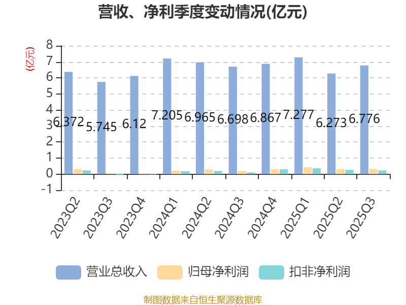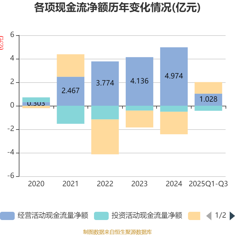 2025年前三季度,公司经营活动现金流净额为1.03亿元,同比下降68.67%;筹资活动现金流净额9856.01万元,同比增加4.03亿元;投资活动现金流净额-4275.2万元,上年同期为-3607.62万元。