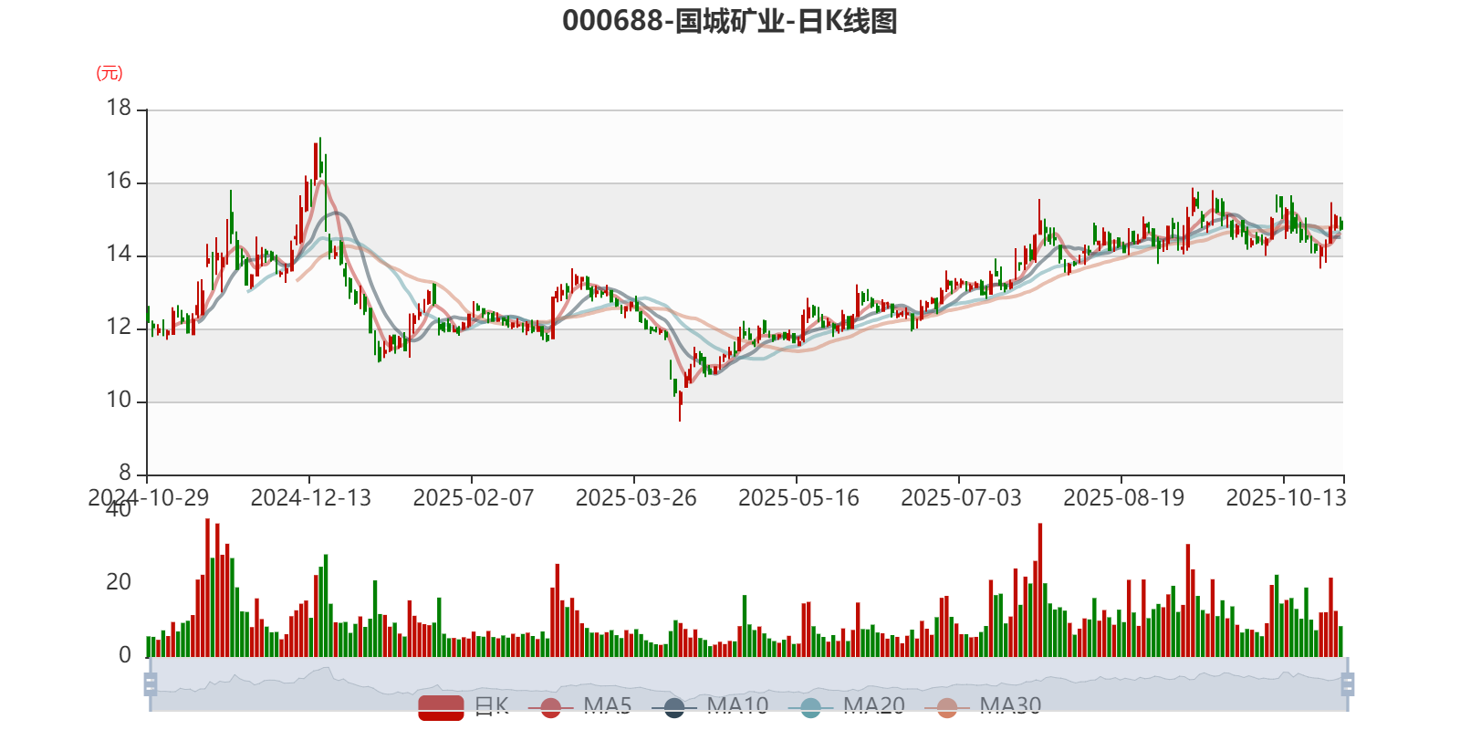 中证智能财讯国城矿业(000688)10月29日披露2025年第三季度报告。前三季度公司实现营业总收入17.18亿元,同比增长24.60%;归母净利润4.5亿元,同比增长765.89%;扣非净利润亏损2.03亿元,上年同期盈利5870.35万元;经营活动产生的现金流量净额为-3.16亿元,上年同期为1.98亿元;报告期内,国城矿业基本每股收益为0.406元,加权平均净资产收益率为13.97%。
