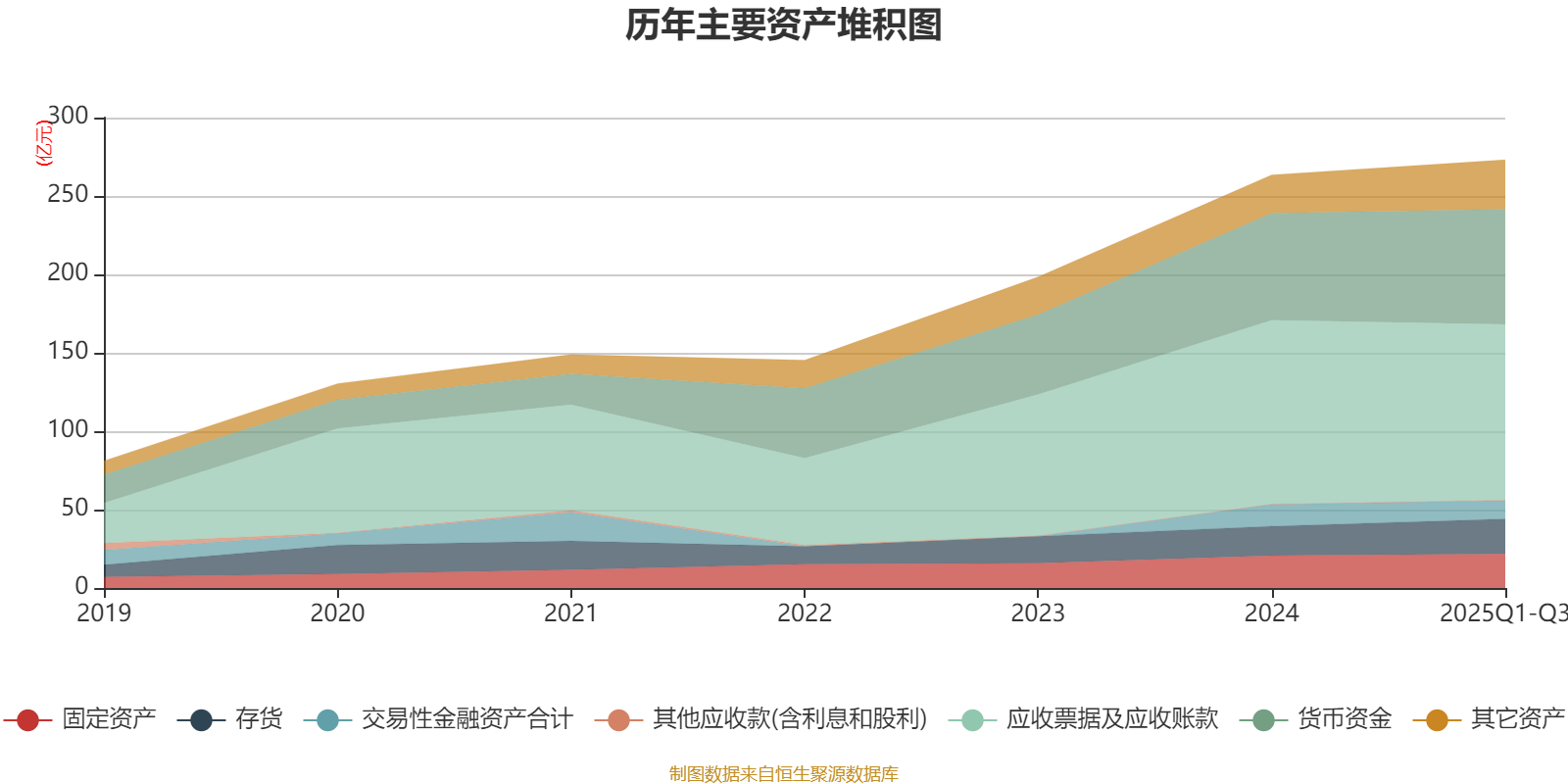 资产重大变化方面,截至2025年三季度末,公司应收票据及应收账款较上年末减少4.55%,占公司总资产比重下降3.52个百分点;在建工程合计较上年末增加100.63%,占公司总资产比重上升1.07个百分点;存货较上年末增加18.78%,占公司总资产比重上升1.04个百分点;货币资金较上年末增加7.71%,占公司总资产比重上升1.01个百分点。