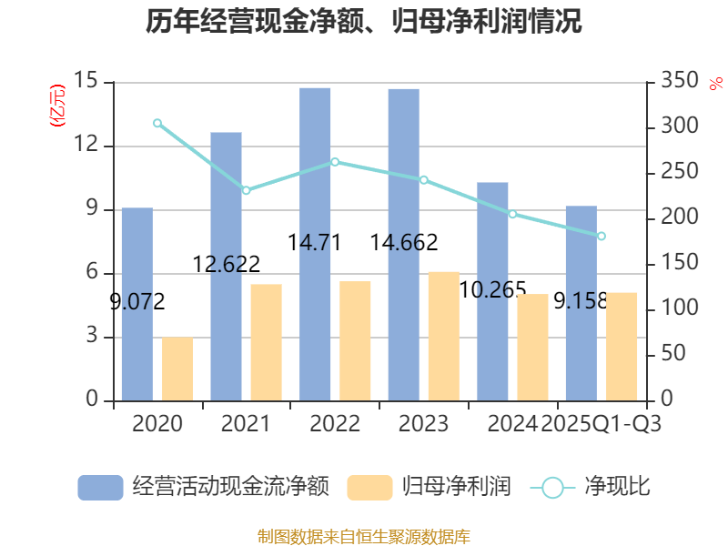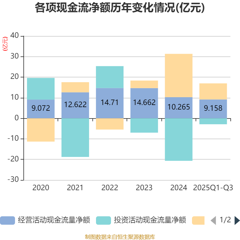 2025年前三季度,公司经营活动现金流净额为9.16亿元,同比下降0.42%;筹资活动现金流净额7.82亿元,同比减少8.33亿元;投资活动现金流净额-2.9亿元,上年同期为-14.27亿元。