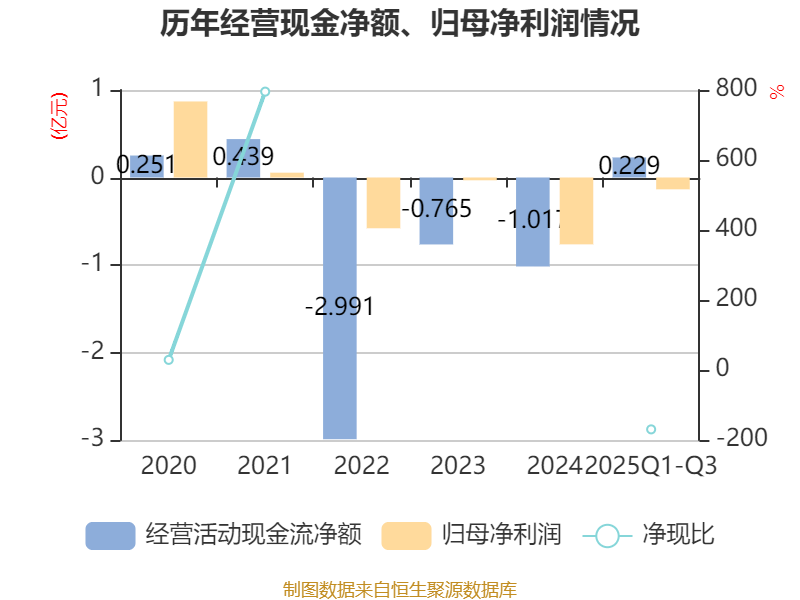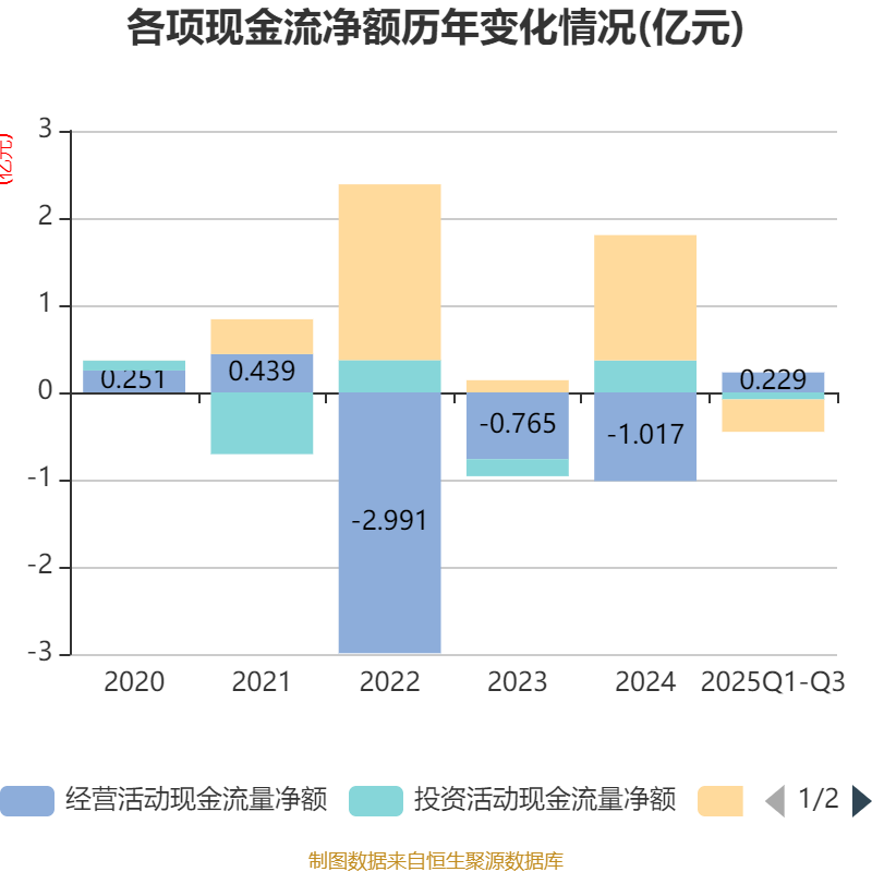 2025年前三季度,公司经营活动现金流净额为2290.29万元,同比增加1.92亿元;筹资活动现金流净额-3710.01万元,同比减少1.54亿元;投资活动现金流净额-810.6万元,上年同期为-1118.75万元。