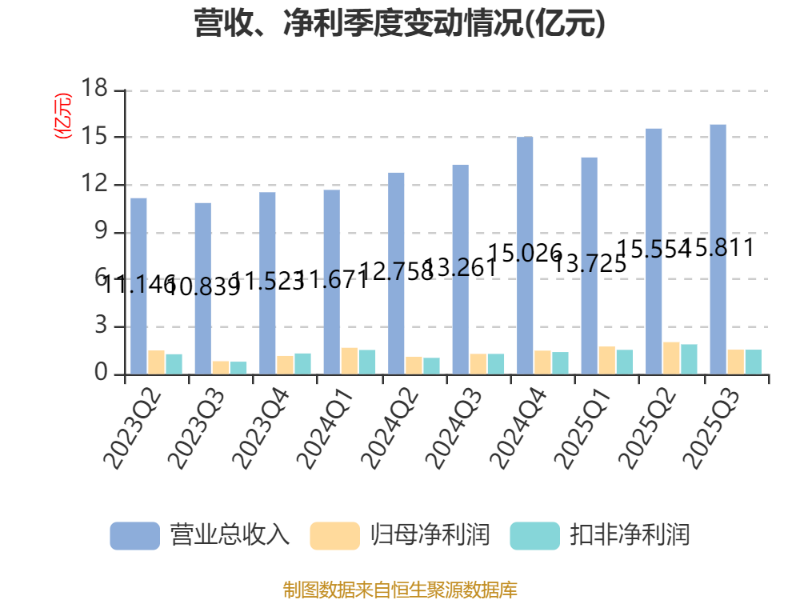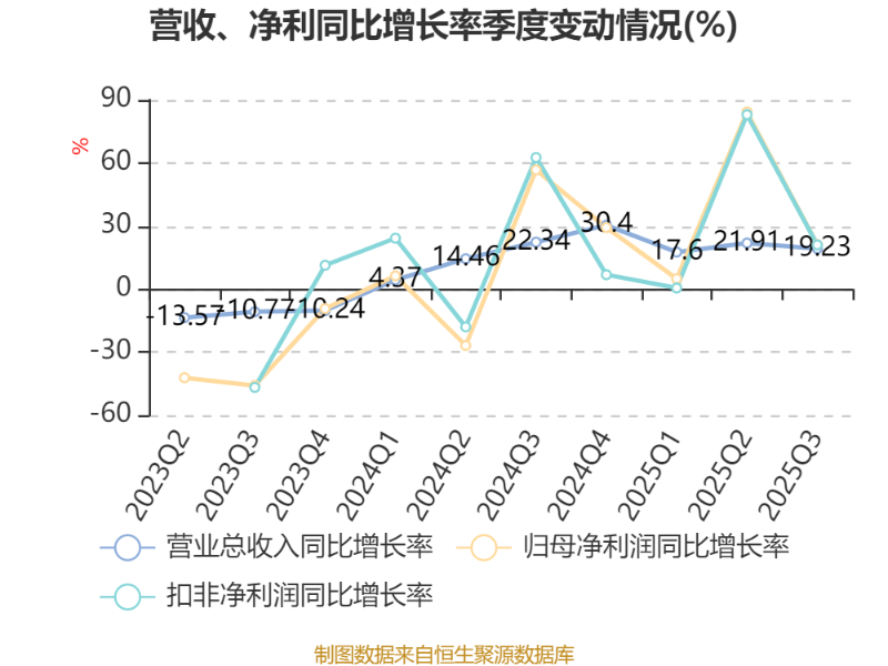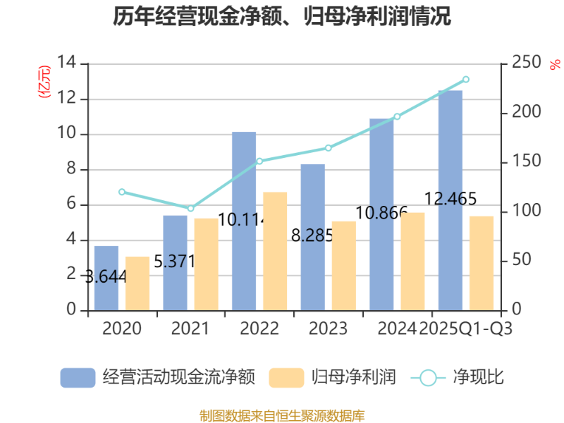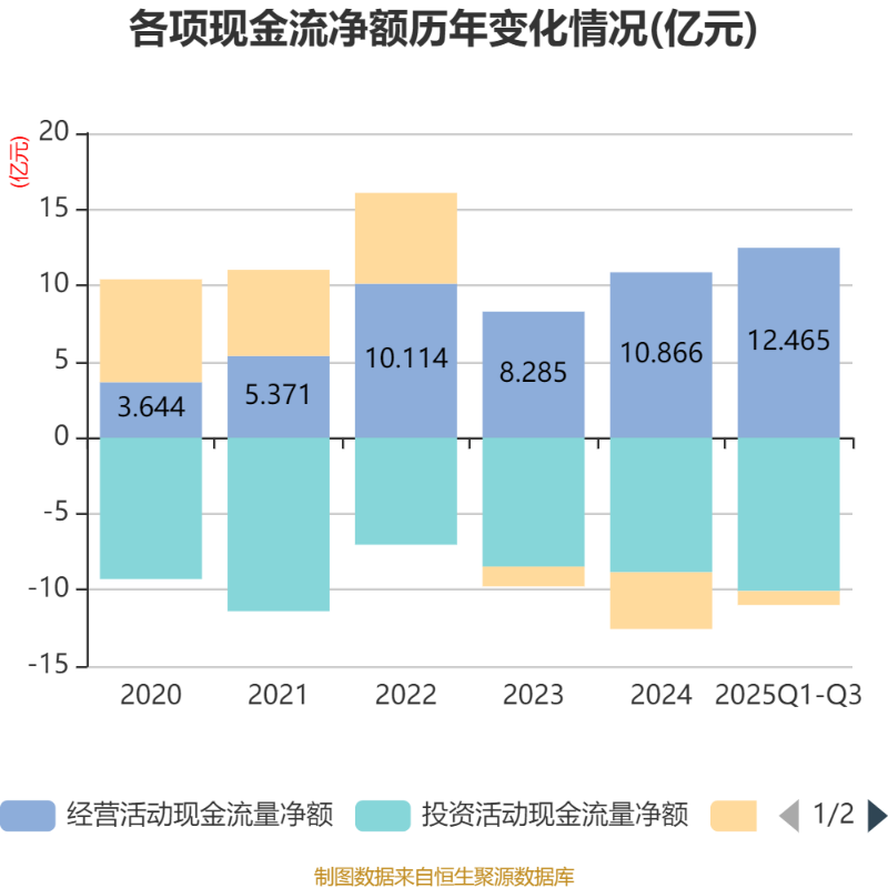 2025年前三季度,公司经营活动现金流净额为12.47亿元,同比增长54.32%;筹资活动现金流净额-9158.84万元,同比增加1.9亿元;投资活动现金流净额-10.07亿元,上年同期为-7.39亿元。