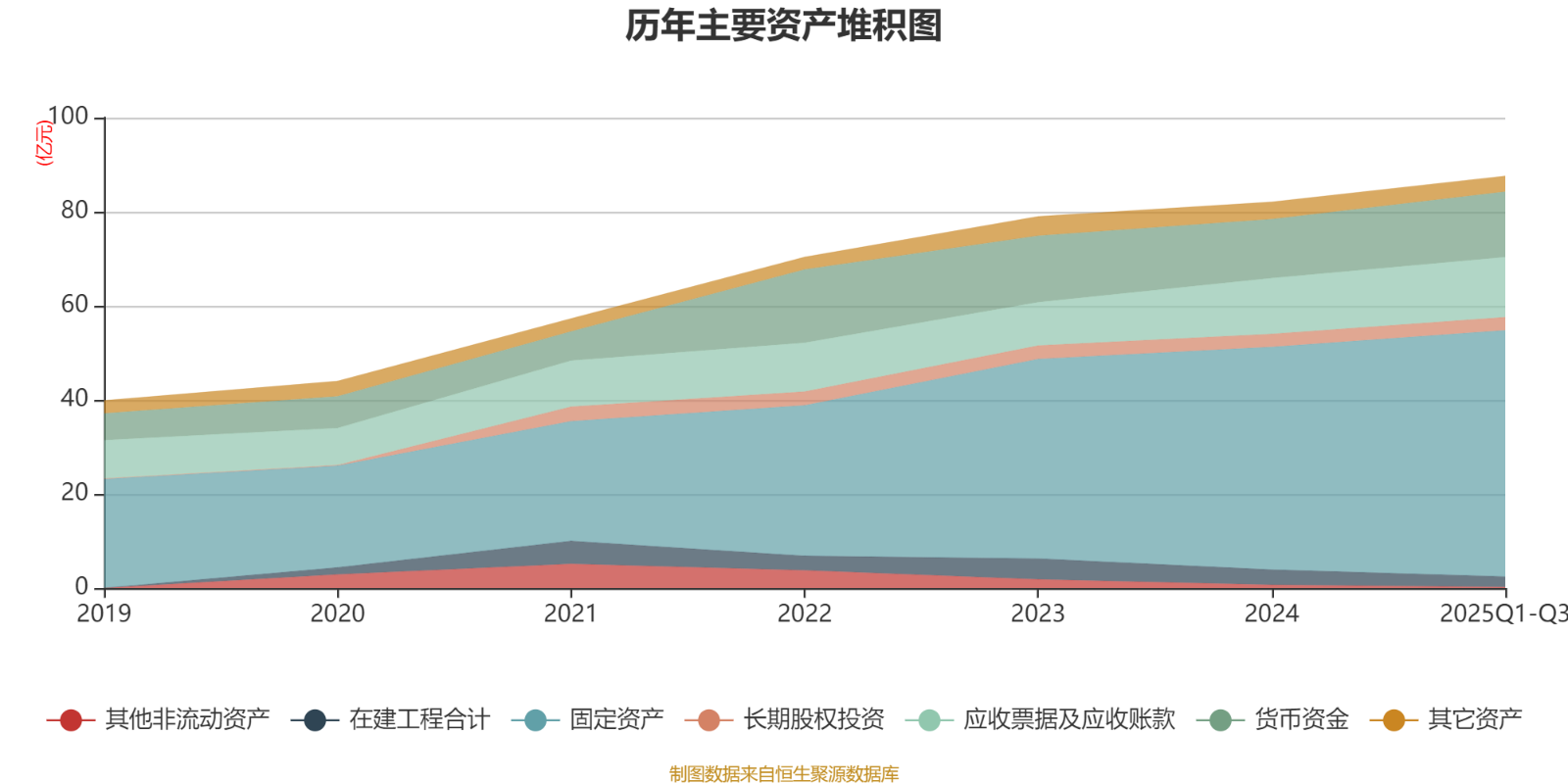 资产重大变化方面,截至2025年三季度末,公司固定资产较上年末增加10.57%,占公司总资产比重上升2.08个百分点;在建工程合计较上年末减少30.8%,占公司总资产比重下降1.38个百分点;其他流动资产较上年末减少60.53%,占公司总资产比重下降0.71个百分点;货币资金较上年末增加11.03%,占公司总资产比重上升0.62个百分点。