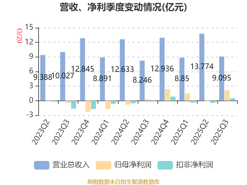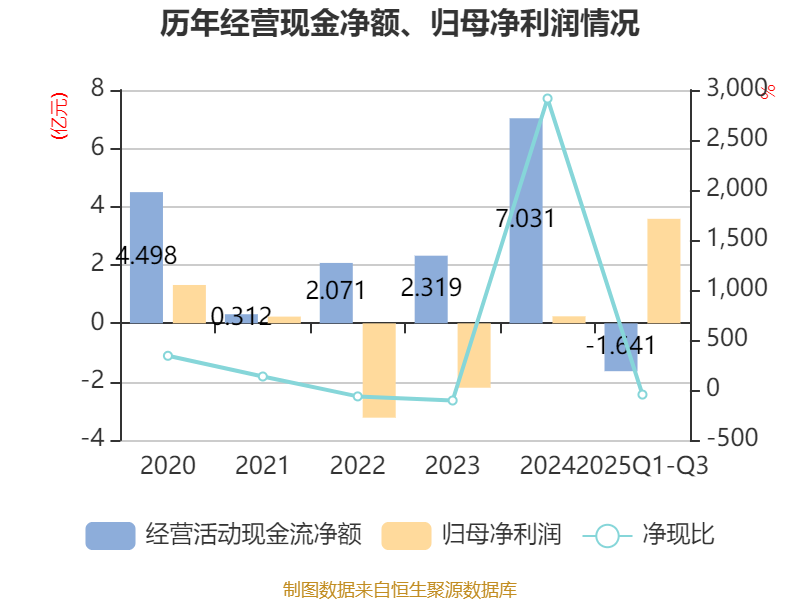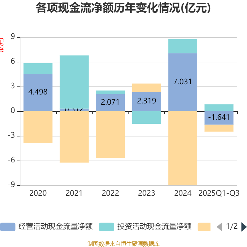 2025年前三季度,公司经营活动现金流净额为-1.64亿元,同比减少4.77亿元;筹资活动现金流净额-8498.9万元,同比增加5.2亿元;投资活动现金流净额8216.18万元,上年同期为1.45亿元。
