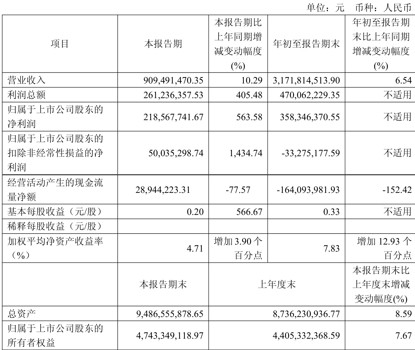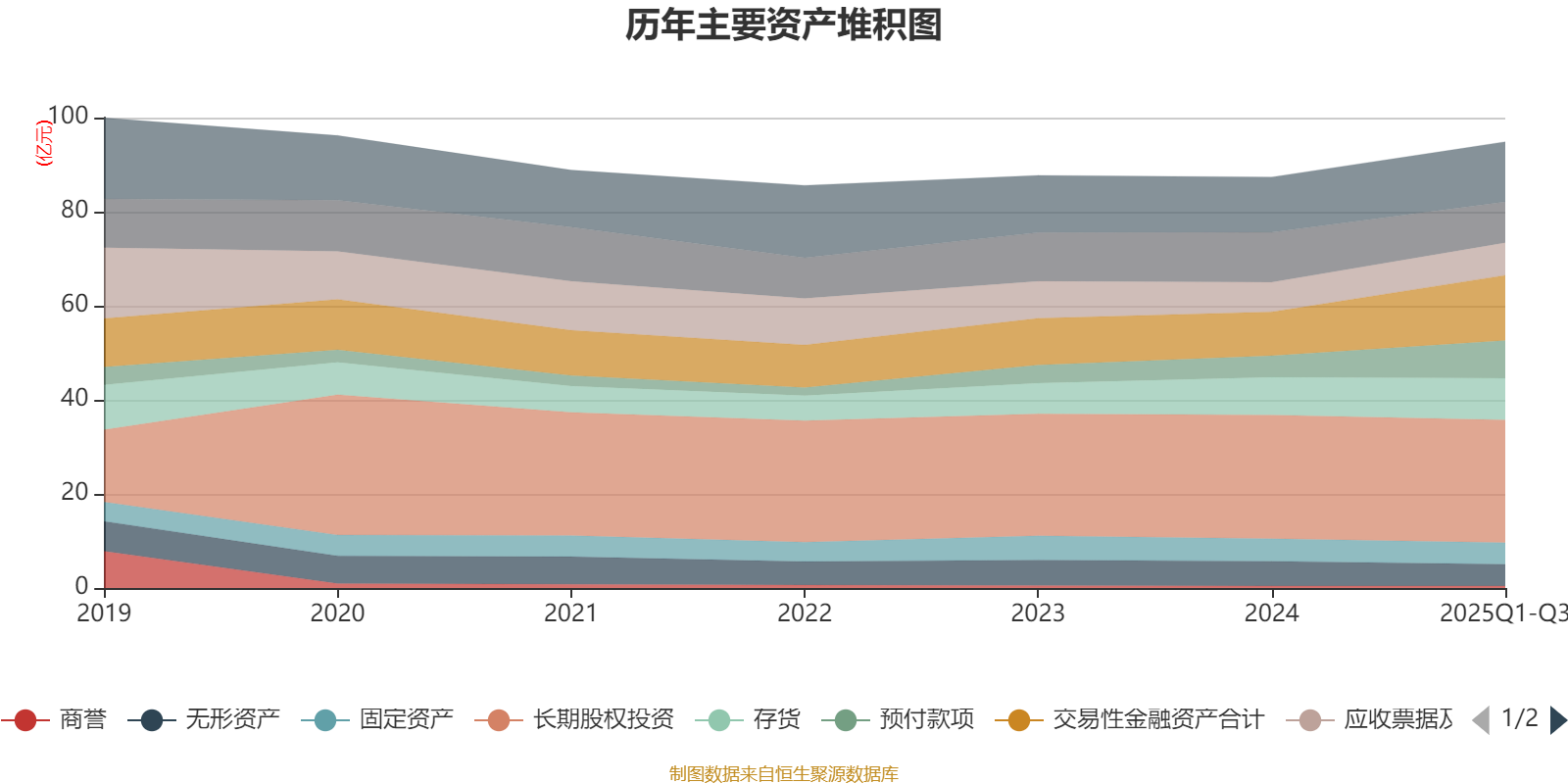 资产重大变化方面,截至2025年三季度末,公司交易性金融资产合计较上年末增加48.38%,占公司总资产比重上升3.92个百分点;预付款项较上年末增加76.54%,占公司总资产比重上升3.27个百分点;货币资金较上年末减少18.15%,占公司总资产比重下降2.99个百分点;长期股权投资较上年末减少0.8%,占公司总资产比重下降2.6个百分点。