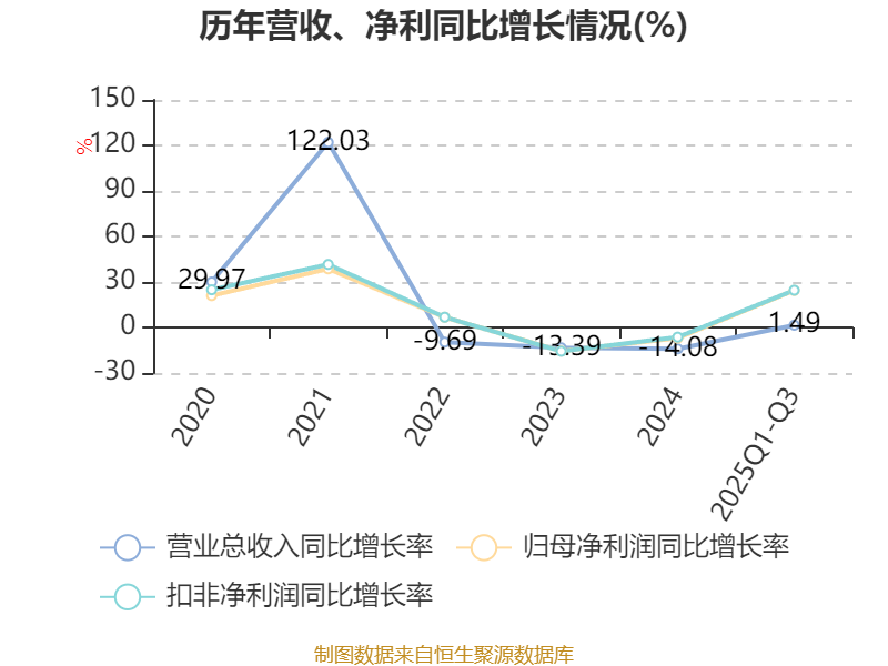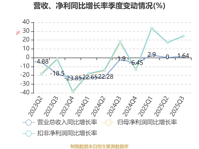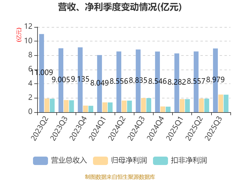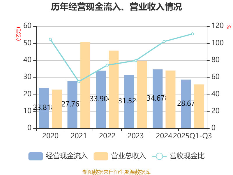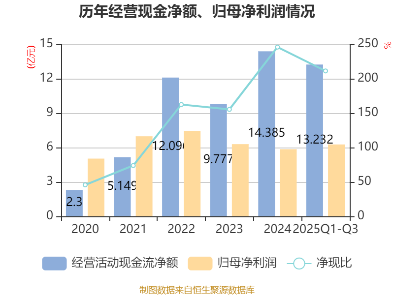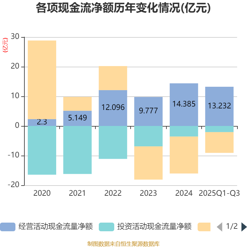 2025年前三季度,公司经营活动现金流净额为13.23亿元,同比增长25.46%;筹资活动现金流净额-7亿元,同比增加4332.86万元;投资活动现金流净额-2.07亿元,上年同期为-2.79亿元。