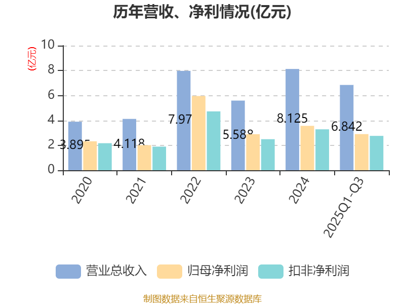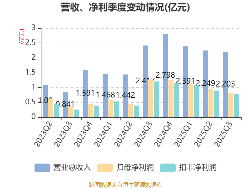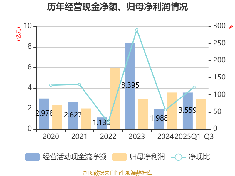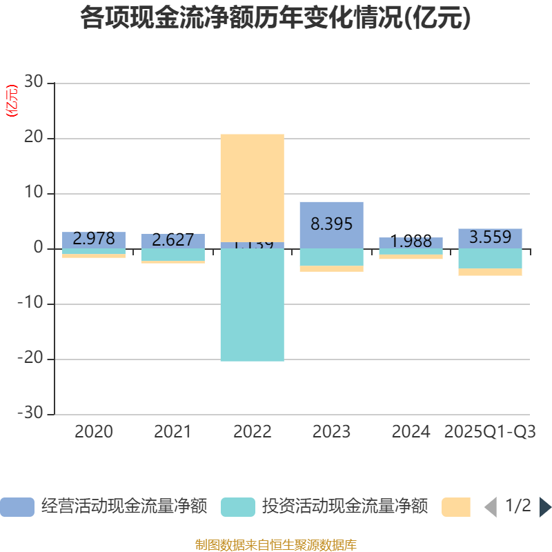 2025年前三季度,公司经营活动现金流净额为3.56亿元,同比增长240.36%;筹资活动现金流净额-1.3亿元,同比减少7197.37万元;投资活动现金流净额-3.64亿元,上年同期为4672.43万元。