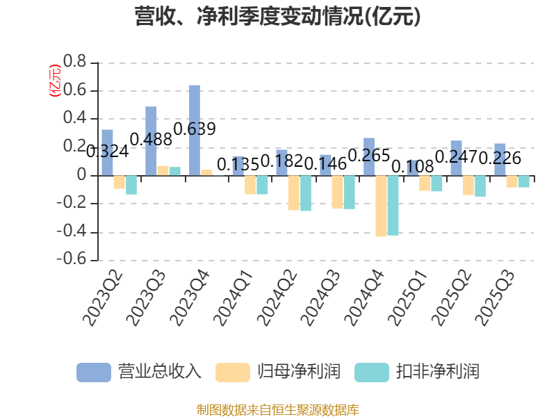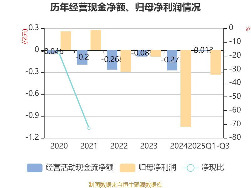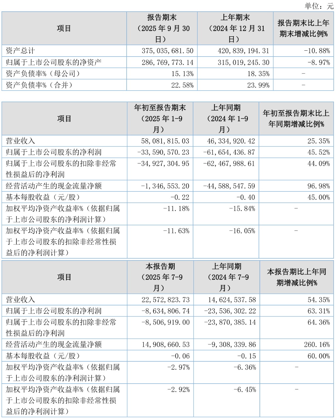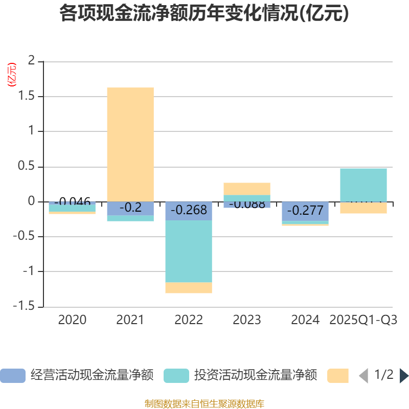 2025年前三季度,公司经营活动现金流净额为-134.66万元,同比增加4324.2万元;筹资活动现金流净额-1555.95万元,同比减少1374.43万元;投资活动现金流净额4723.94万元,上年同期为2028.53万元。