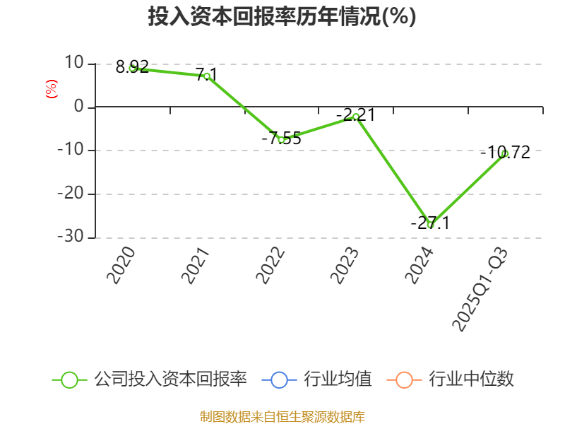 盈利能力方面, 2025年前三季度公司加权平均净资产收益率为-11.18%,同比上升4.66个百分点。公司2025年前三季度投入资本回报率为-10.72%,较上年同期上升4.9个百分点。