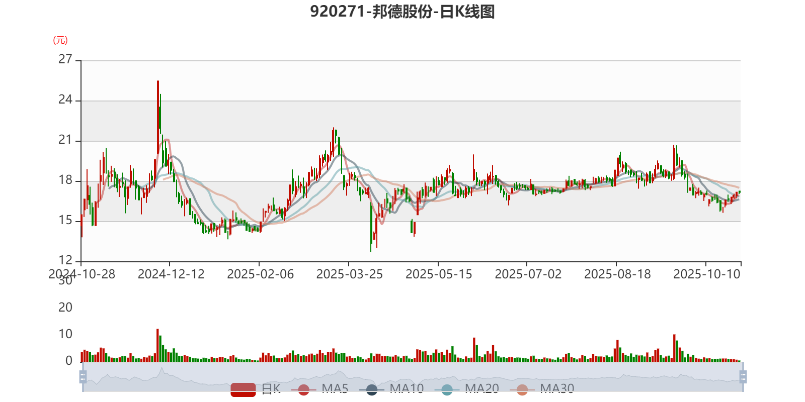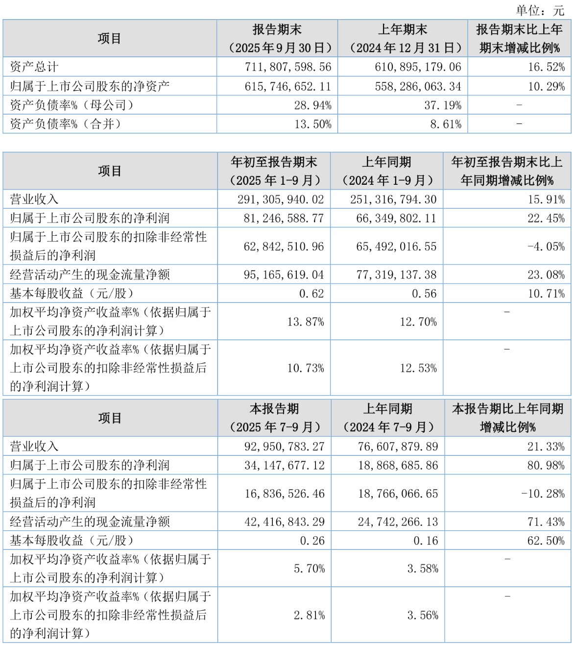 中证智能财讯邦德股份(920271)10月28日披露2025年第三季度报告。前三季度公司实现营业总收入2.91亿元,同比增长15.91%;归母净利润8124.66万元,同比增长22.45%;扣非净利润6284.25万元,同比下降4.05%;经营活动产生的现金流量净额为9516.56万元,同比增长23.08%;报告期内,邦德股份基本每股收益为0.62元,加权平均净资产收益率为13.87%。