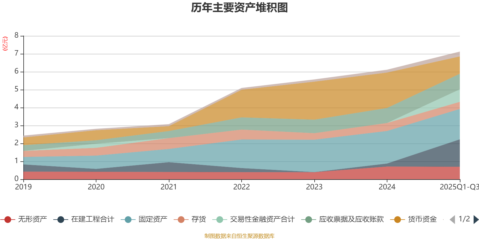 资产重大变化方面,截至2025年三季度末,公司在建工程合计较上年末增加837.38%,占公司总资产比重上升18.86个百分点;货币资金较上年末减少51.02%,占公司总资产比重下降18.72个百分点;交易性金融资产合计占公司总资产的9.83%,上年末为0;固定资产较上年末减少6.89%,占公司总资产比重下降5.98个百分点。