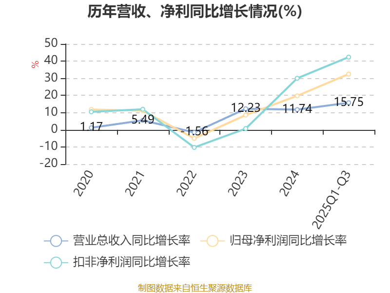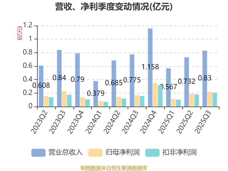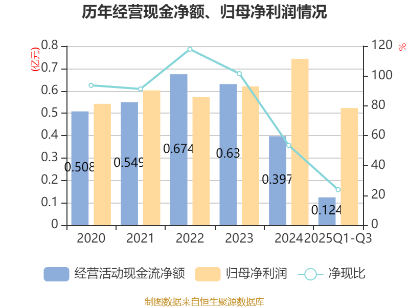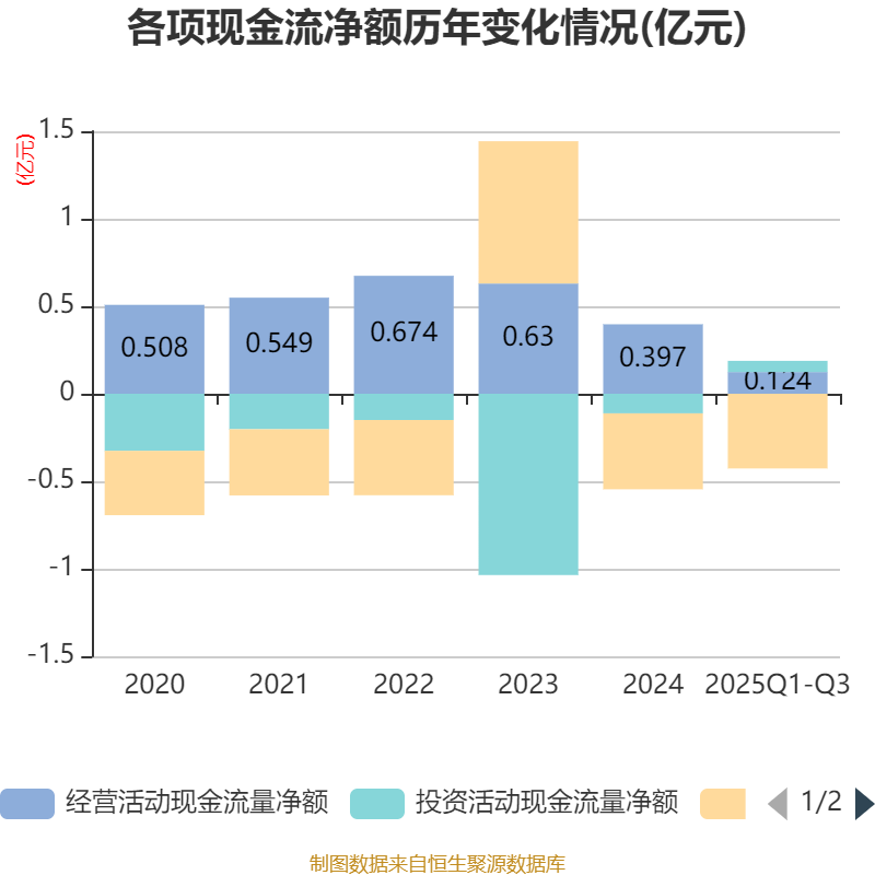 2025年前三季度,公司经营活动现金流净额为1240.52万元,同比增长29.63%;筹资活动现金流净额-4270万元,与同期相比基本不变;投资活动现金流净额641.92万元,上年同期为874.96万元。