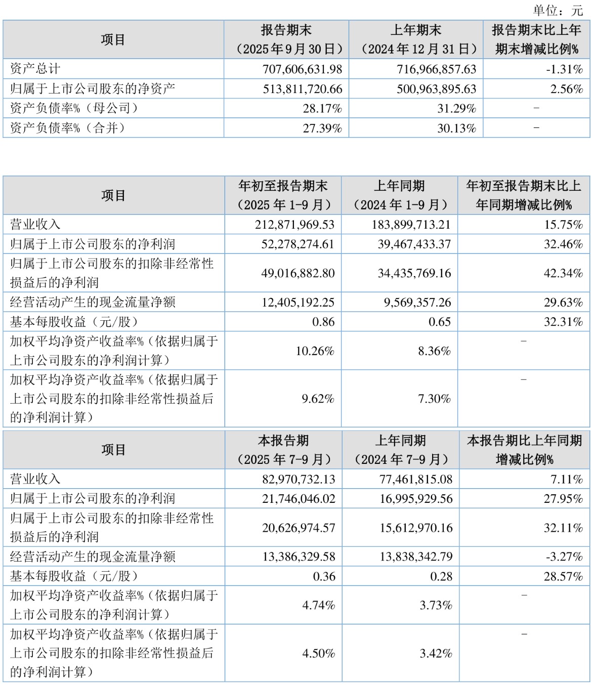 中证智能财讯天罡股份(920651)10月28日披露2025年第三季度报告。前三季度公司实现营业总收入2.13亿元,同比增长15.75%;归母净利润5227.83万元,同比增长32.46%;扣非净利润4901.69万元,同比增长42.34%;经营活动产生的现金流量净额为1240.52万元,同比增长29.63%;报告期内,天罡股份基本每股收益为0.86元,加权平均净资产收益率为10.26%。