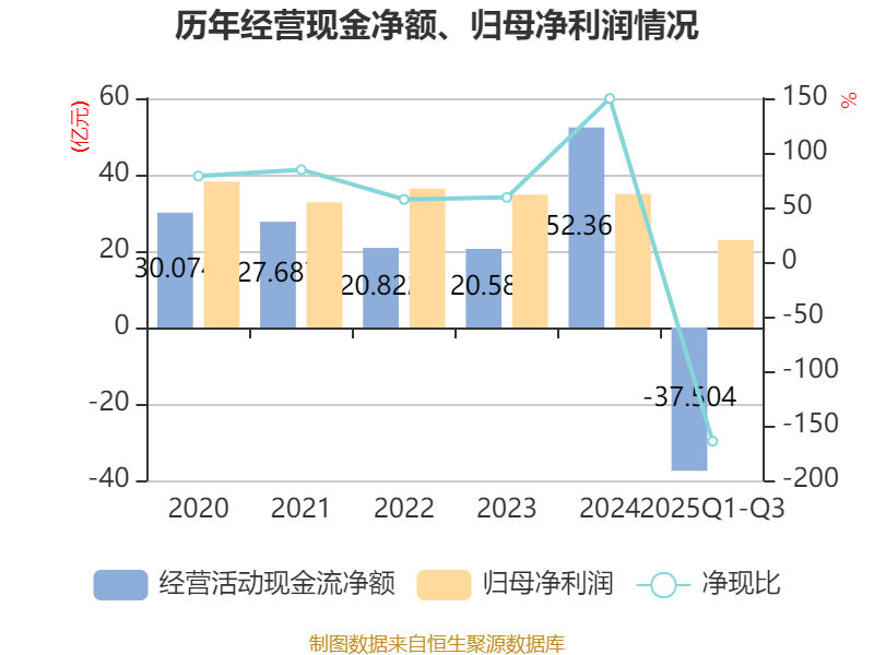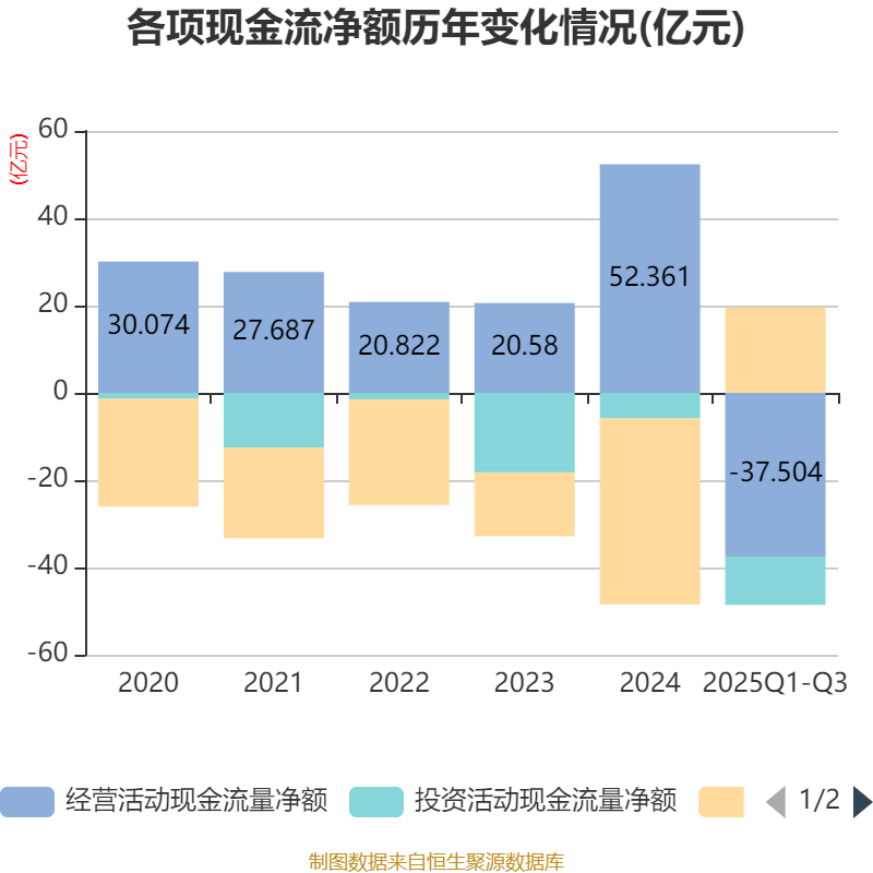 2025年前三季度,公司经营活动现金流净额为-37.5亿元,同比减少71.51亿元;筹资活动现金流净额19.56亿元,同比增加60.56亿元;投资活动现金流净额-11.06亿元,上年同期为-20.65亿元。