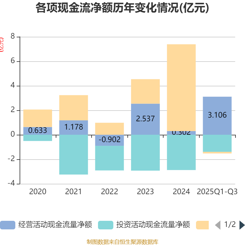 2025年前三季度,公司经营活动现金流净额为3.11亿元,同比增加3.76亿元;筹资活动现金流净额-1297.21万元,同比减少7.94亿元;投资活动现金流净额-1.4亿元,上年同期为-2.64亿元。